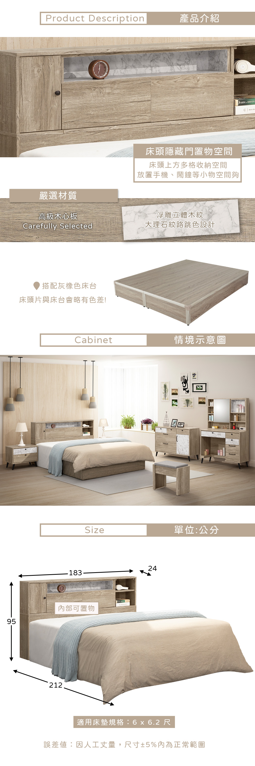 ◆床頭隱藏門置物空間◆簡約浮雕立體木紋設計◆嚴選高級木心板材質◆免組裝專人配送到府◆鄉村、田野梧桐原木風格◆床頭箱+床台組合◆床頭箱深度24cm整組配件: 6尺床頭箱 + 6尺床台(不含床墊)適用床墊規格:6 x 6.2 尺尺寸:寬 183 x 深 212 x 高 95 公分材質:高級木心板、三分夾板床台顏色:灰橡木色產地:台灣誤差值:因人工丈量,尺寸±5%內為正常範圍