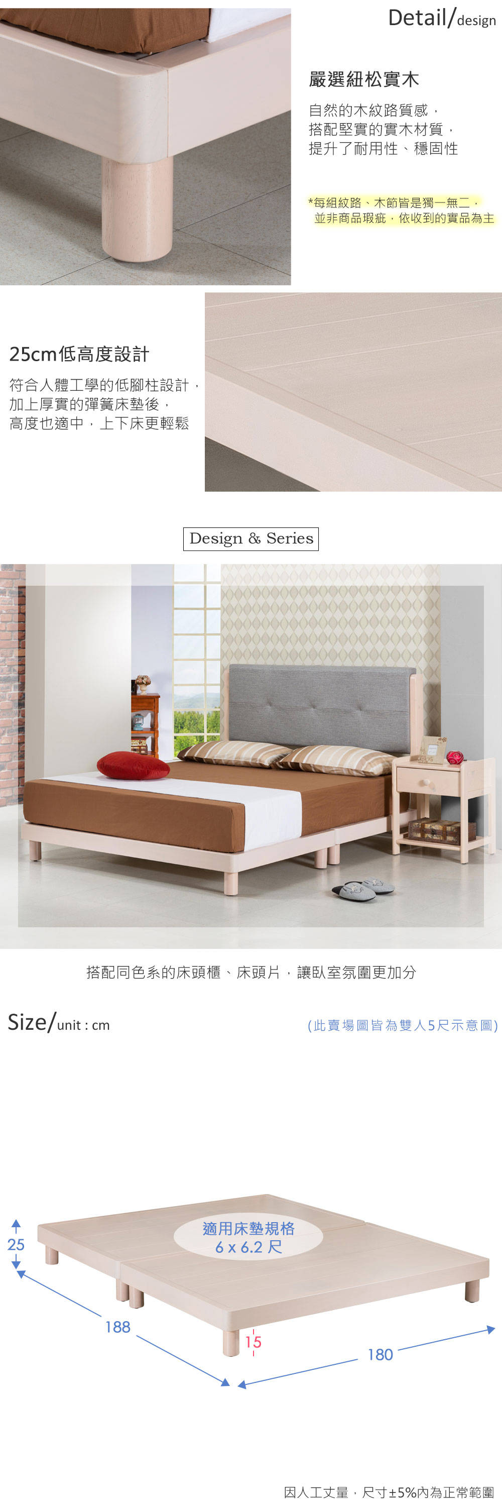 ◆低腳柱設計,適用各種床墊◆堅實耐用的實木材質◆腳柱穩固,不易搖晃◆專人到府安裝定位整組配件: 6尺床底 x1 (不含床墊)尺寸:寬 180 x 深 188 x 高 25 公分適用床墊規格:6 x 6.2 尺材質:松木實木顏色:象牙白產地:台灣誤差值:因人工丈量,尺寸±5%內為正常範圍