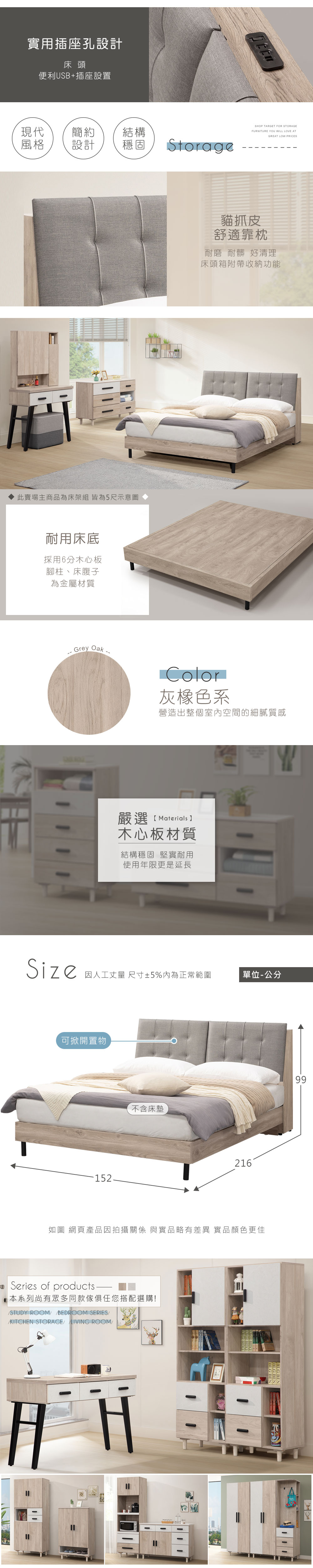 ◆床頭附實用USB插座◆嚴選木心板耐用材質◆耐磨貓抓皮舒適靠枕◆免組裝專人配送到府◆韓系奶油暖色風格◆床頭箱+床架設計整組配件:5尺床頭箱 + 5尺床架(不含床墊)尺寸:長 216 x 寬 152 x 高 99 公分材質:高級木心板、貓抓皮靠墊、鐵腳顏色:灰橡色產地:台灣適用床墊規格:5 x 6.2尺誤差值:因人工丈量,尺寸±5%內為正常範圍
