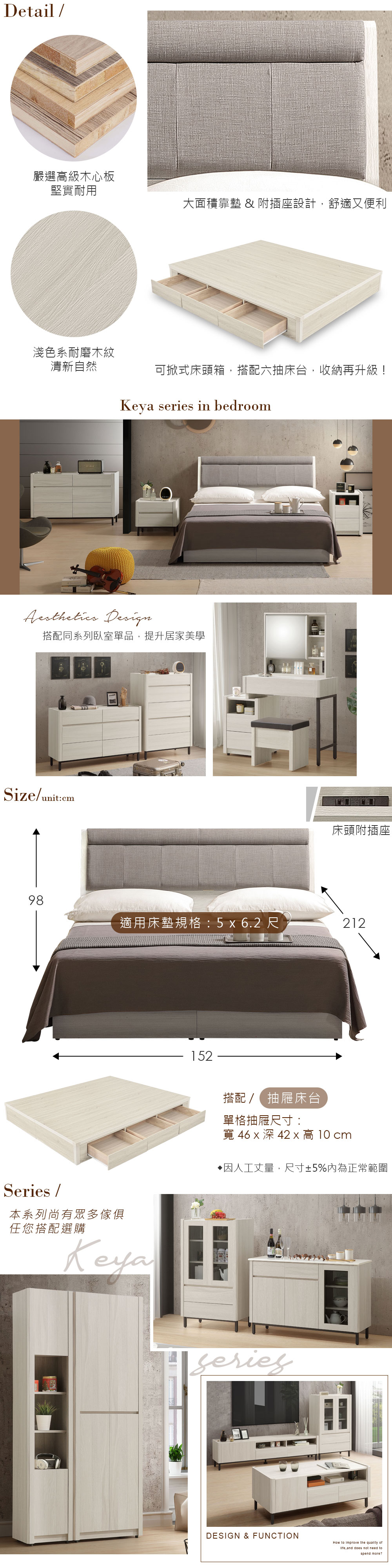 ◆木心板材質,堅實、穩固、耐用◆清新淺色系,質感木紋路視覺◆大面積靠墊設計,靠躺舒適服貼◆靠墊可掀開,大容量收納空間◆附安全插座,手機、3C充電好方便◆搭配抽屜床台,共六抽屜,分類收納好整齊!◆免組裝,專人配送到府整組商品:床頭箱 x 1 + 抽屜床台 x 1 (不含床墊)尺寸:寬 152 x 深 212 x 高 98 公分適用床墊規格:5 x 6.2 尺材質:高級木心板顏色:白榆木色產地:台灣誤差值:因人工丈量,尺寸±5%內為正常範圍