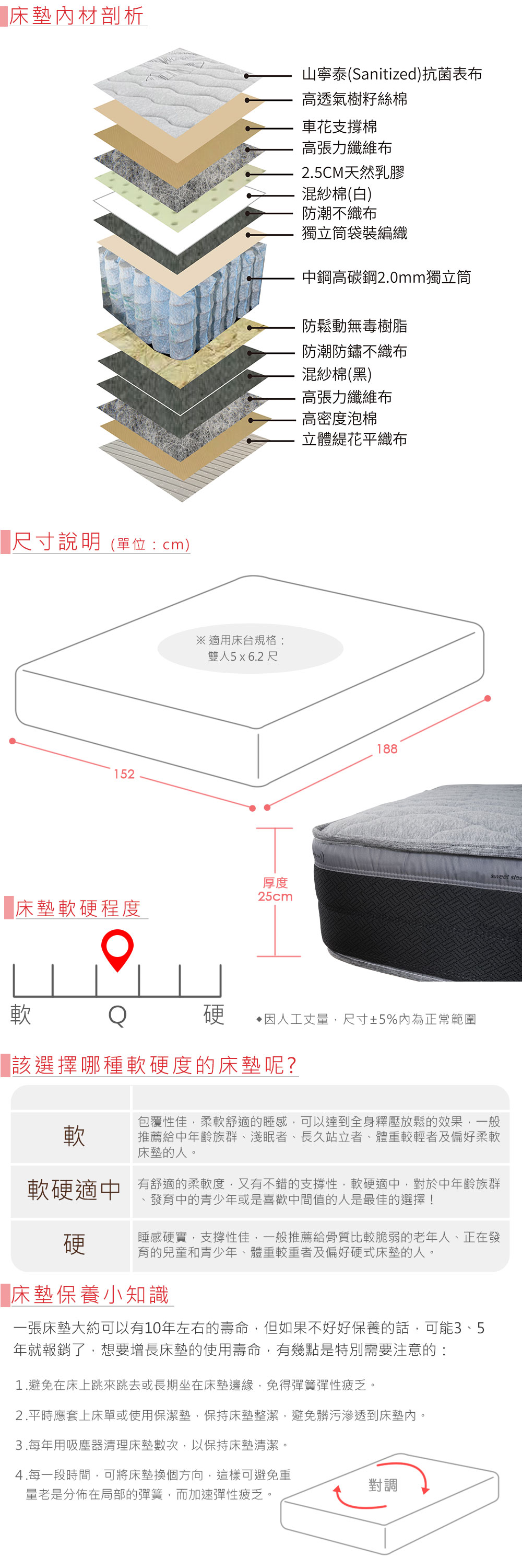 ◆瑞士Sanitized鋅離子表布◆2.5cm高柔軟天然乳膠◆2.0mm中鋼高碳鋼獨立筒◆床墊軟硬度:Q◆厚度25公分◆專人配送,到府安裝