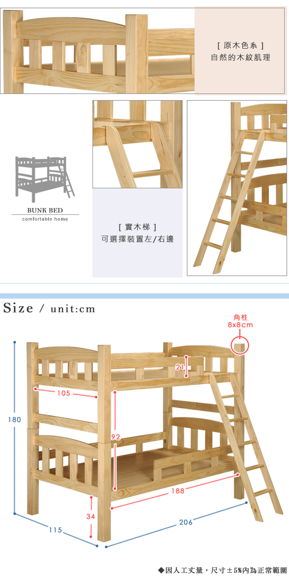 ◆簡約款外型設計◆清新的原木色系◆穩固的實木材質◆可依需求拆解為二張單人床◆掛勾式斜樓梯設計整組配件─ 3.5尺雙層床 x1整組尺寸─ 長 206 x 寬 115 x 高 180 公分適用床墊規格─ 3.5 x 6.2 尺材質─ 松木實木+4分夾板床板顏色─ 原木色產地─ 台灣誤差值─ 因人工丈量,尺寸±5%內為正常範圍
