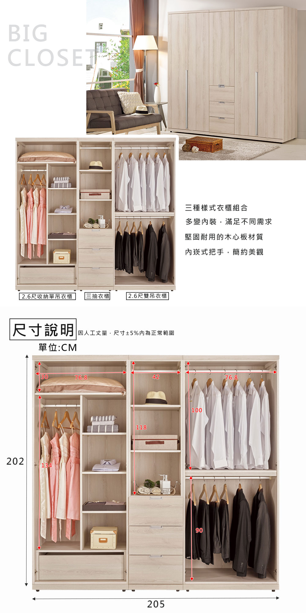 ◆ MIT鋼珠滑軌,開闔不費力◆ 附5片活動層板,輕鬆調整◆超大空間,再多衣物也不怕◆免自行組裝,專人配送到府◆現代、日式風格◆臥室、更衣室大容量衣物存放◆三吊衣桿、四抽屜、被櫃多元收納方式◆三座併放,也能依需求分開放置尺寸:寬 205 x 深 57 x 高 202 公分材質:高級木心板顏色:洗白木紋產地:台灣誤差值:因人工丈量,尺寸±5%內為正常範圍