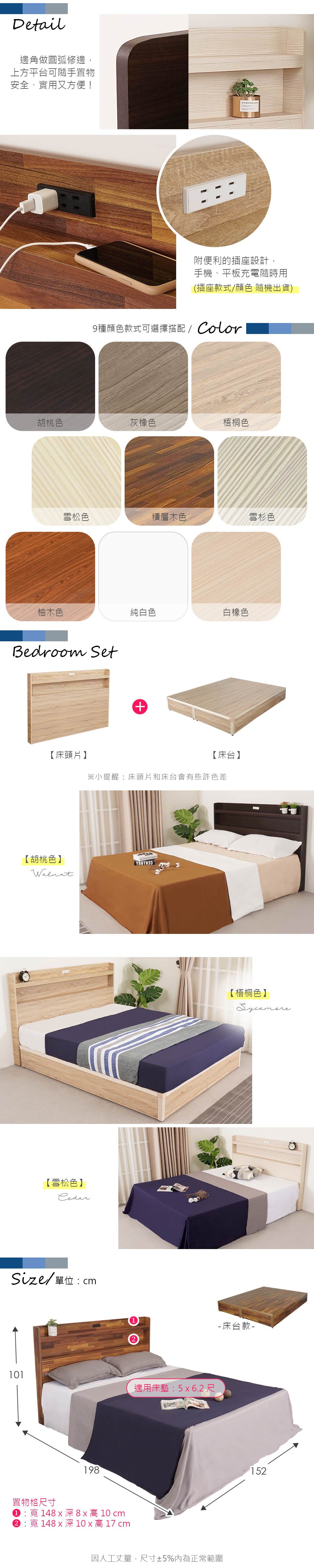 ◆木心板材質,堅實耐用◆附有插座,充電超方便◆床組多色可選,好搭配◆免組裝,專人宅配到府◆床頭片+床台整組商品:5尺床頭片 + 5尺床台(不含床墊)尺寸:寬 152 x 深 198 x 高 101 公分適用床墊:5 x 6.2 尺材質:高級木心板、三分夾板顏色:梧桐色產地:台灣誤差值:因人工丈量,尺寸±5%內為正常範圍