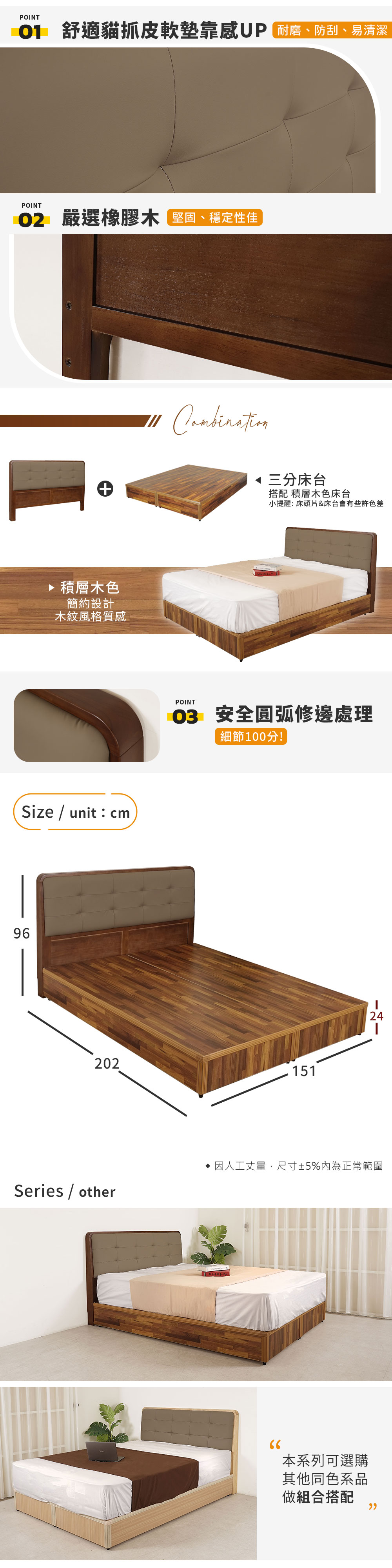 ◆嚴選穩固耐用的橡膠木◆耐磨、防刮貓抓皮靠墊◆日式風格,清新簡約感◆搭配三分床台◆免組裝由專人配送到府整組配件:5尺床頭片x1+5尺床台x1(不含床墊)適用床墊:5 x 6.2 尺尺寸:寬 151 x 深 202 x 高 96 公分材質:貓抓皮、橡膠木、三分夾板顏色:胡桃色產地:台灣/中國誤差值:因人工丈量,尺寸±5%內為正常範圍