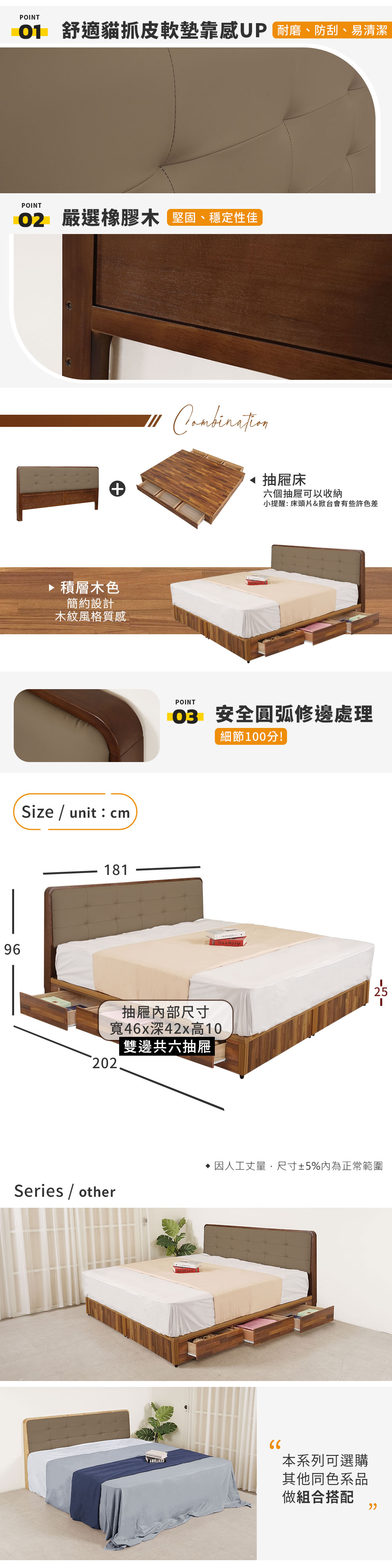 ◆嚴選穩固耐用的橡膠木◆耐磨、防刮貓抓皮靠墊◆日式風格,清新簡約感◆左右邊各三抽屜,共六抽屜◆免組裝由專人配送到府整組配件:6尺床頭片x1+6尺床台x1(不含床墊)適用床墊:6 x 6.2 尺尺寸:寬 181 x 深 202 x 高 96 公分床頭片材質:貓抓皮、橡膠木床台材質:三分夾板顏色:胡桃色產地:台灣/ 中國誤差值:因人工丈量,尺寸±5%內為正常範圍