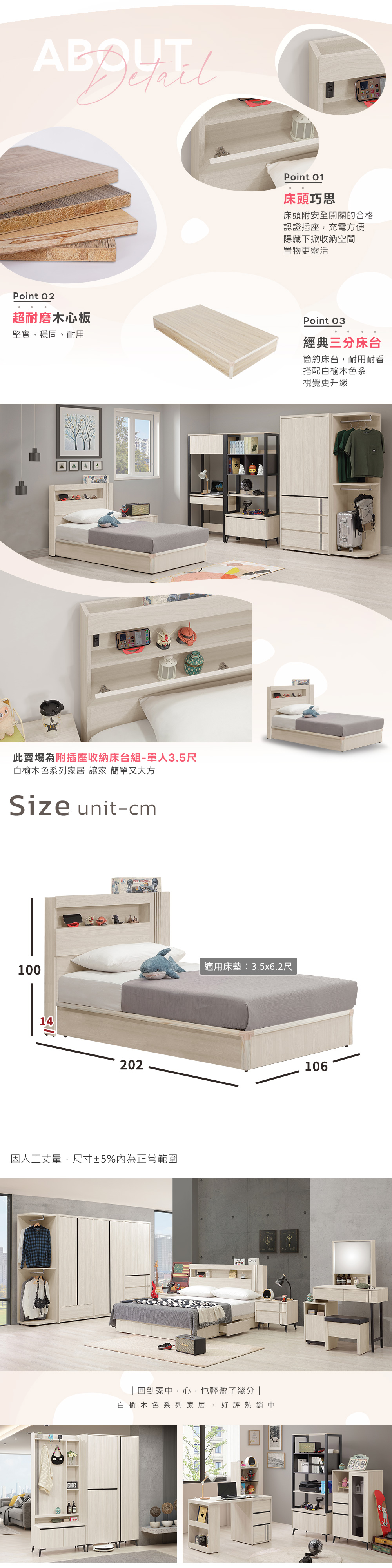 ◆白榆現代、英倫風格◆床頭附有插座,方便充電◆床頭隱藏下掀收納小物◆床頭片+床台組合◆免自行組裝,專人配送到府整組商品:3.5尺床頭片 x 1 + 3.5床台 x 1尺寸:寬 106 x 深 202 x 高 100 公分適用床組規格:3.5 x 6.2 尺材質:高級木心板+三分夾板顏色:白榆木色產地:台灣誤差值: 因人工丈量,尺寸±5%內為正常範圍