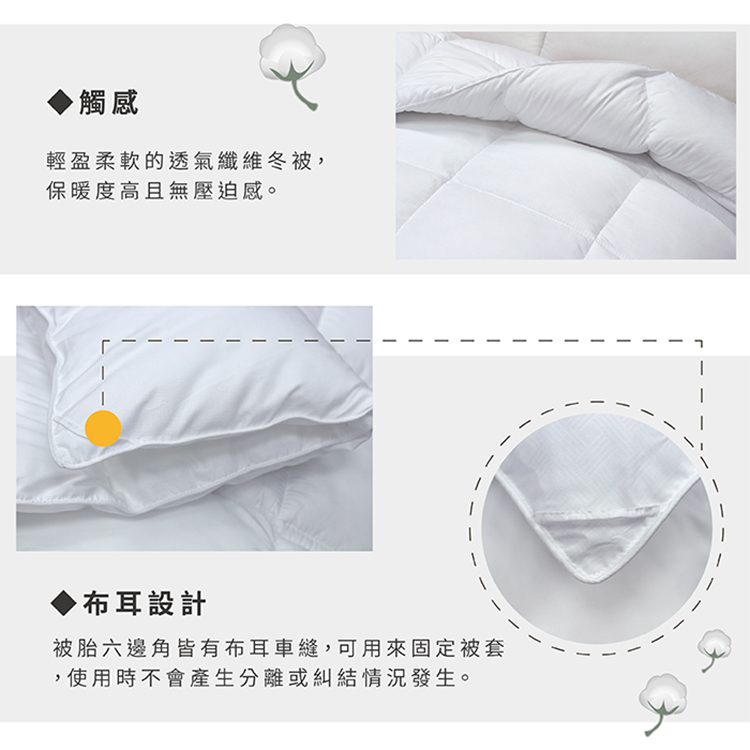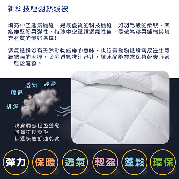 ★商品特色:*輕量:纖維柔軟纖細如天然羽絨*手感佳:具極佳的手感和保暖性,有蓄溫及阻絕冷空氣之功效*蓬鬆度佳:保暖性和蓬鬆性媲美天然羽絨,車格超膨鬆,牢牢固定填充物,舒服又溫暖*不生菌:聚酯纖維本身有不易生蹣的優勢,是理想的填充物之一*枕頭表布採超細纖維布,觸感細密柔滑舒適,與身體柔順接觸無粗硬感品質精緻,透氣纖維材質,清爽舒適,採蓬鬆超細彈性纖維,熱銷NO.1