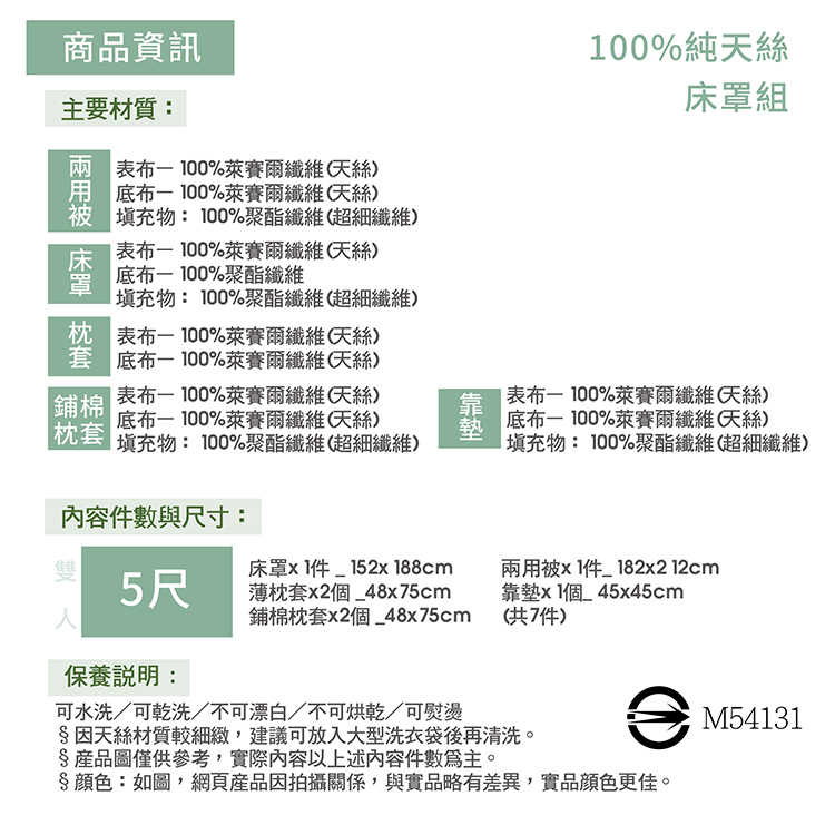 ★材質:兩用被表布-100%萊賽爾纖維(天絲)底布─100%萊賽爾纖維(天絲)填充物─100%聚酯纖維(超細纖維)