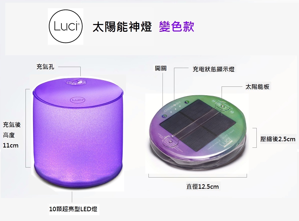 設計:重量113公克設定防水可達1公尺太陽能板,電池和LED燈一體成型九段式亮燈:每按一下固定一色,按到第九下為循環變色可折疊和擴張:13公分直徑,2.6公分收縮高度,11.5公分展開高度防水防塵等級IP67照射範圍14平方公尺10顆超亮LED燈充電:鋰電池壽命300~500次(日常使用2年以上)防過度充電保護裝置防過電流,防短路保護裝置使用一般燈可持續12小時亮燈(需在太陽光下充滿8小時)可在太陽光和燈泡下充電(建議陽光直射為佳)尺寸:充氣展開-13.5CM(直徑)*12.5CM(高)壓縮收納-13.5CM* 2CM 包裝(1個)13.5* 2CM重量:200克包裝(單組含包裝)充電時間:8小時可充滿蓄電池,點亮時間:6〜12小時