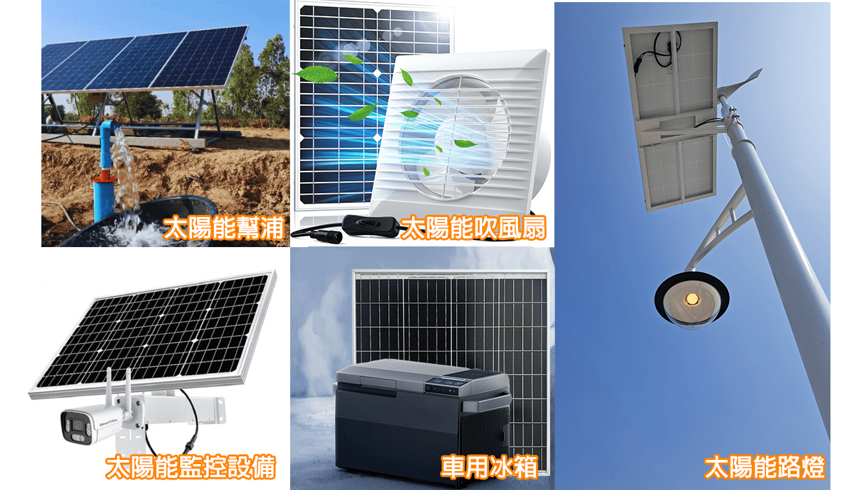 我們製造的中小型客製化太陽能板被廣泛的應用到許多地方,如便攜式太陽能系統、離網電站、公車站牌、太陽能通訊、太陽能路燈、停車場售票機、監視攝影機、森林監控系統(如火災監控等等)、農田水利灌溉監控、水壩水庫監控(如水位監控等等)和偏遠地區的供電等等。