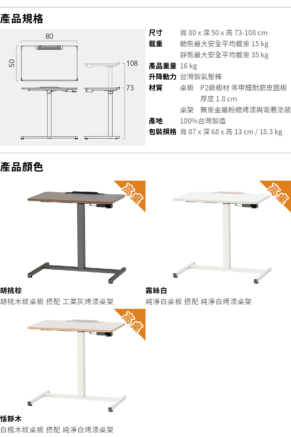 尺寸 寬 80 x 深 50 x 高 73-108 cm載重 動態最大安全平均載重 15 kg 靜態最大安全平均載重 35 kg產品重量 16 kg升降動力 臺灣製氣壓棒材質 桌板 P2級板材 零甲醛耐磨皮面板 厚度 1.8 cm 桌架 無重金屬粉體烤漆與電著塗裝產地 100%臺灣製造包裝規格 寬 87 x 深 68 x 高 13 cm / 18.3 kg