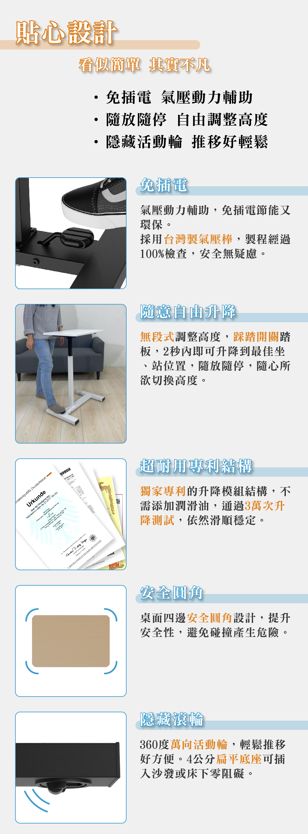 尺寸 寬 60 x 深 40 x 高 64-92 cm載重 動態最大安全平均載重 10 kg 靜態最大安全平均載重 30 kg產品重量 9 kg升降動力 臺灣製氣壓棒材質 桌板 P2級板材 零甲醛耐磨美耐皿板 厚度 1.5 cm 桌架 無重金屬粉體烤漆與電著塗裝產地 100%臺灣製造包裝規格 寬 68 x 深 44 x 高 17 cm / 9.5 kg