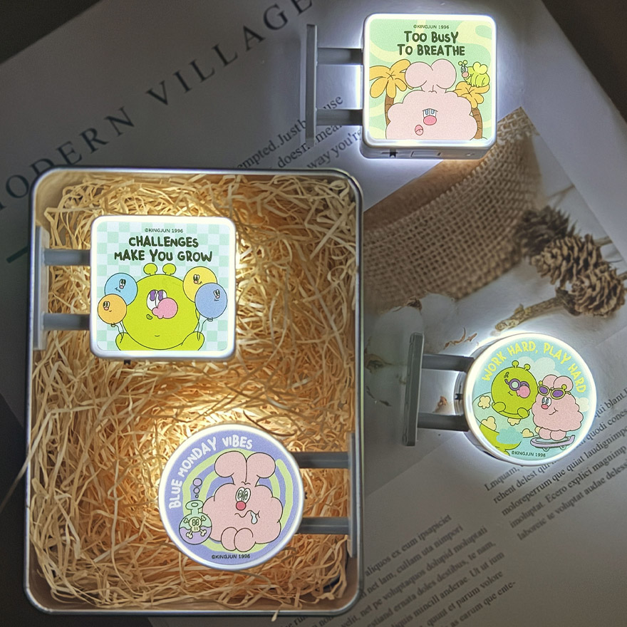 *顏色因電腦螢幕解析度的不同,會與實體商品顏色稍有落差,請以實體商品顏色為主*要求完美者請勿下單*包裝盒未提供保固及退換貨服務歡樂繽紛KINGJUN磁吸小燈牌亮麗造型一次推出4款,款款必集活力語錄加上KINGJUN繽紛鮮明超Q圖像表情超療癒可吸附桌邊.冰箱磁性面板或是平擺置放是生活中必收療癒小物,就是生活中那個歡樂的光!!!尺寸:約5.5*2*4cm材質:ABS塑膠.LED燈.磁鐵