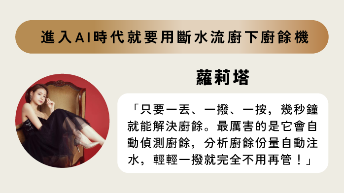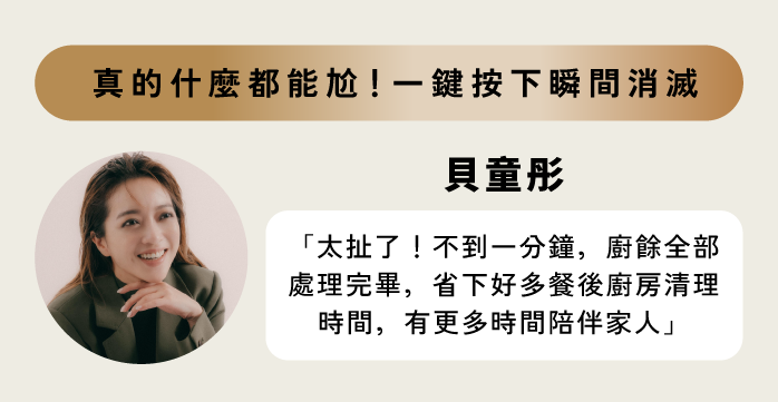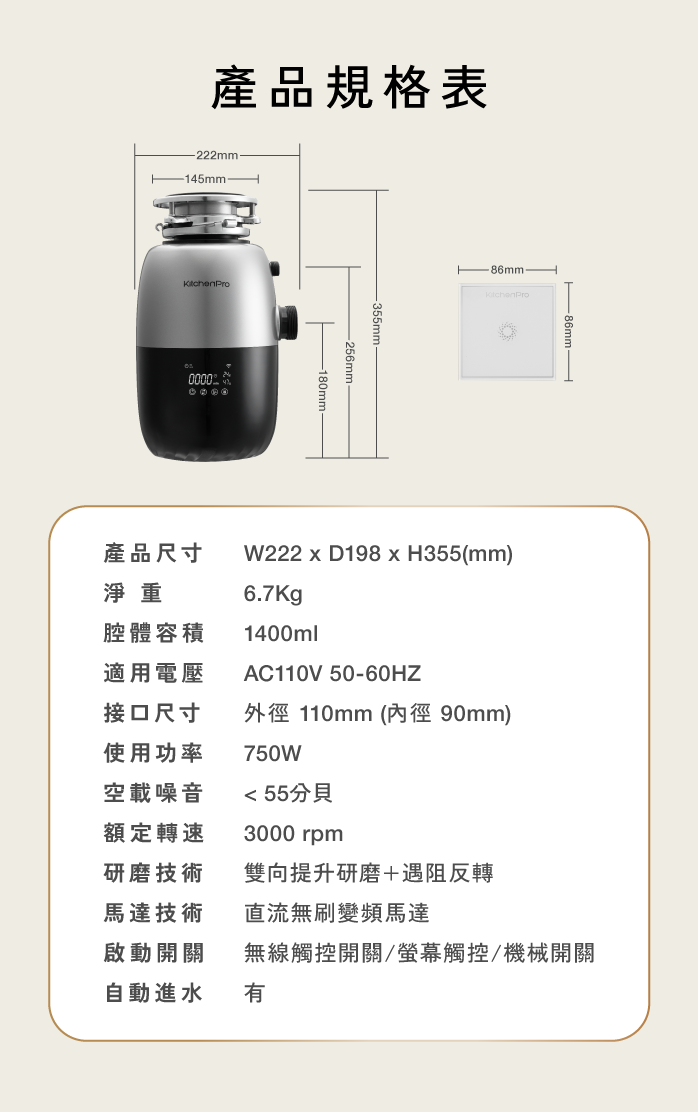 ※注意:1.房子若非新建案,屋齡約3年以上或排水較不通順之流理臺建議先請通排水人員處理後安裝較為理想。2.安裝後發現排水不順者也建議進行通排水。⭐⭐⭐⭐⭐ 強力推薦 斷水流廚餘機 ⭐⭐⭐⭐⭐屈中恆:大師兄回來了!馬力歐:廚餘別再冰冰箱啦!貝童彤:太扯了太扯了!蘿莉塔:丟廚餘不要在停留在上個時代了!邵阿咩:大胃王海陸大餐速度對決!彥窩:「豬大骨30秒打成汁!」阿康:只要一鍵,就可以輕鬆解決廚餘!*36個月安心保固*信用卡3期/6期0利率*限時優惠免安裝費------------------------------------------------------------【產品規格】● 產品尺寸:W222 xD198 xH355(mm)● 產品淨重:6.7Kg● 腔體容積:1,400ml● 適用電壓:AC110V 50-60Hz● 接口尺寸:外徑110mm (內徑 90mm)● 使用功率:750W● 空載噪音:<55分貝<br>● 額定轉速:3,000 rpm● 研磨技術:雙向提升研磨+遇阻反轉● 馬達技術:直流無刷變頻馬達● 啟動開關:無線觸控開關/螢幕觸控/機械開關● 自動進水:有----------------------------------------------------------------傳統廚餘處理的痛點,你中了幾個?🔸 追垃圾車:每日等待,費時又麻煩。🔸 存放冰箱:佔空間,異味難聞。🔸 直接丟垃圾桶:容易滋生蚊蟲與異味。🔸 傳統廚餘機:雖能粉碎,但仍需手動處理殘渣。AI 智能四步驟,一鍵消滅廚餘Step1. 啟動粉碎:無線藍牙控制開關,免鑽牆、免拉線,靈活安裝。Step2. 倒入廚餘:多功能安全塞,輕鬆放入廚餘。Step3. 研磨成汁:AI 自動注水,智慧偵測廚餘量,精準供水,提高研磨效率。Step4. 強力排出:TurboMax 60,000Pa 渦輪水壓,沖走所有殘渣,保持水管暢通。強勁動力,無懼挑戰🔹 德國變頻無刷馬達:高速運轉,自動偵測硬度,智慧調整扭力。🔹 8 道研磨工序:渦流進水 → 高速研磨 → 捶擊粉碎 → 交錯切割 → 變頻扭力 → 分層過濾 → 離心迴旋 → 強壓排水。🔹 零晃動降噪設計:精密平衡研磨盤,減震降噪 <50dB,安靜運作不擾人。<br>🔹 智慧防卡功能:每次開機自動反轉,防止卡頓,自動拋除異物,確保順暢運行。強力水流,確保水管暢通🔹TurboMax 60,000Pa 強壓渦輪排水:不僅是廚餘機,更是水管守護者!🔹 6 公尺高強力水柱:可沖至 3 樓高,徹底沖走油污與細小顆粒。🔹20 段智慧防堵系統:偵測水流狀況,自動加壓排水,避免水管堵塞。貼心安全設計🔸 8 重安全防護:✔ 多功能安全塞 ✔ 兒童安全鎖 ✔ 專屬安全插梢 ✔ 阻燃材質✔ 無刀刃設計 ✔ 過載保護 ✔ 過熱保護 ✔ 智慧自動關機🔸 LED 高清觸控面板:即時顯示運行狀況,廚房環境一目了然。----------------------------------------------------------------▲以上均含安裝◆安裝須知服務規範說明:下單前請先預安裝之現場符合以下條件1.有足夠空間擺放機器(如已達現場因尺寸不合無法安裝則需酌收工本費)2.有自來水源3.有110V電源及排水孔,(220V需事先告知)。4.如需鑽孔,請先聊聊告知小編(木質檯面.不鏽鋼水槽.石材檯面.其他檯面) 。5.含配送安裝費用請先告知地區、樓層、有無舊機回收(偏遠地區請先聊聊)。6.外島恕不安裝。7.下單後留下姓名電話,3天內即有專人與您聯繫安排安裝時間(例假日除外) 。8.安裝時間依照技工評估現場狀況,安裝位置需距離水源3公尺內,超過此標準距離需酌收管線費用。9.技師安裝拆箱時請確認產品是否完整◆鑑賞期 特別注意事項◎鑑賞期非適用期或使用期,商品經安裝或使用後,僅供保固服務 ◎消費者享有鑑賞期的權益。但鑑賞期並非試用期,您所退回的商品必須是全新的狀態且完整包裝;請注意保持商品本體、配件、贈品、保證書、原廠包裝所有附隨文件或資料以及原廠外盒的完整性。為了維護您的權益,下標前請記得先聊聊詢問產品庫存及商品資訊,確定後再下單,如經拆封或使用,將影響您的退貨權益。