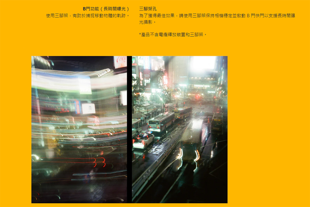 機身輕巧,方便攜帶新版升級內置星形濾鏡支援135規格所有底片可用於三腳架固定相機拍攝微小光源,創造出光束斑效果鍍膜改良玻璃鏡頭提升影像的清晰度長時間曝光功能助於捕捉移動的軌跡適用於夜間攝影,支援長曝光拍攝本產品不含電池、底片 需另行購買