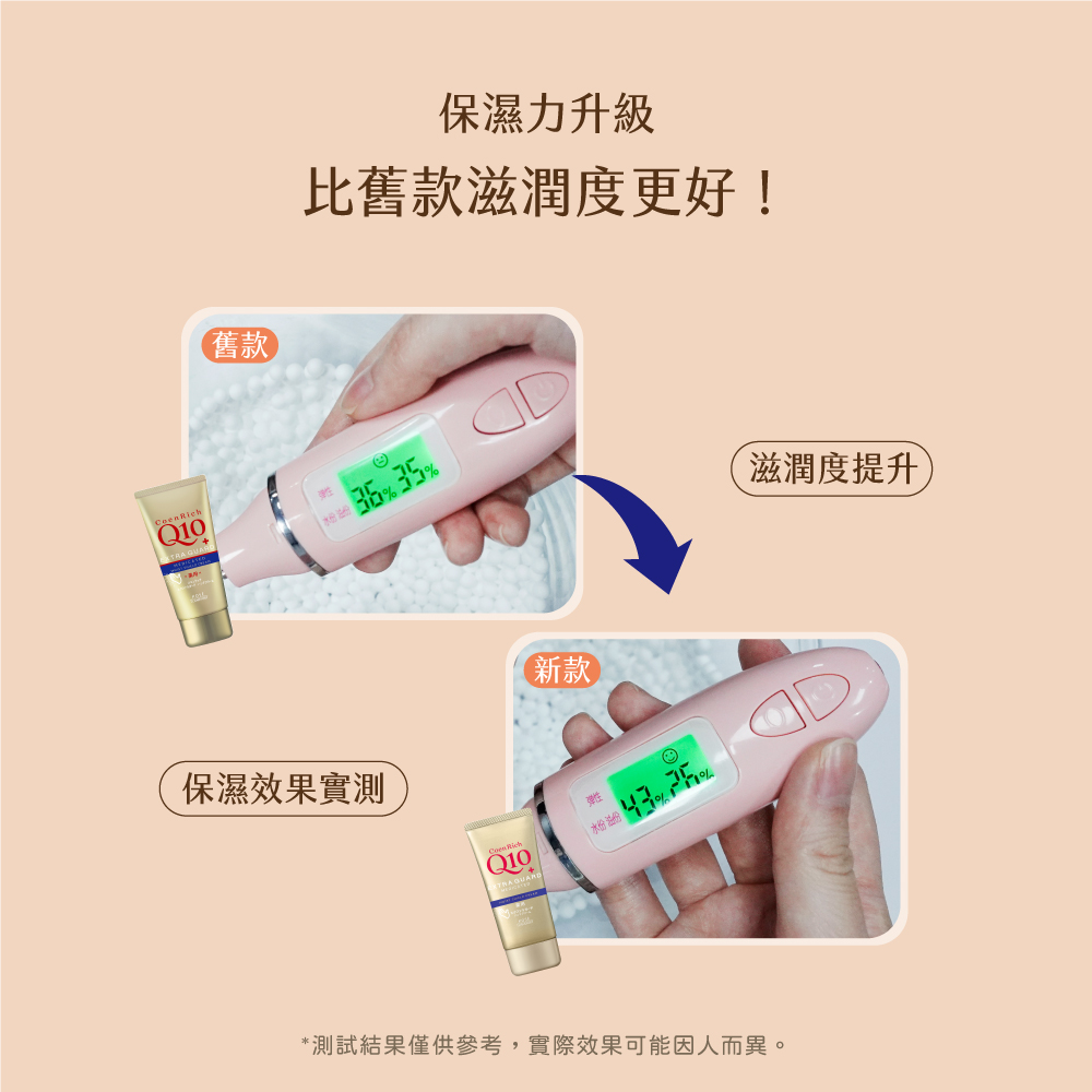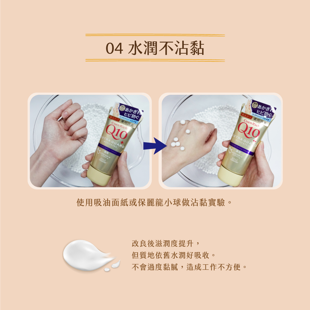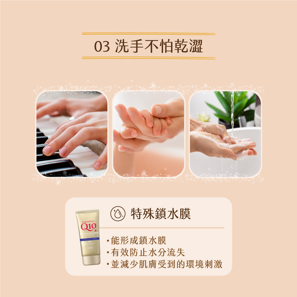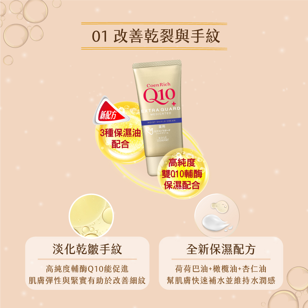 高濃度Q10與多種潤護精華改善乾紋恢復柔滑嫩手。