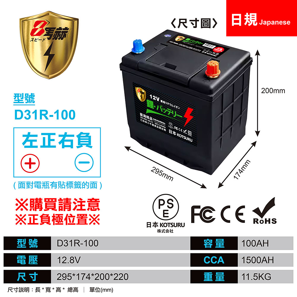 【KOTSURU】D31L-100、D31R-100 8馬赫 【日規】汽車電瓶 鋰鐵啟動電池 12V 100AH 1500CCA