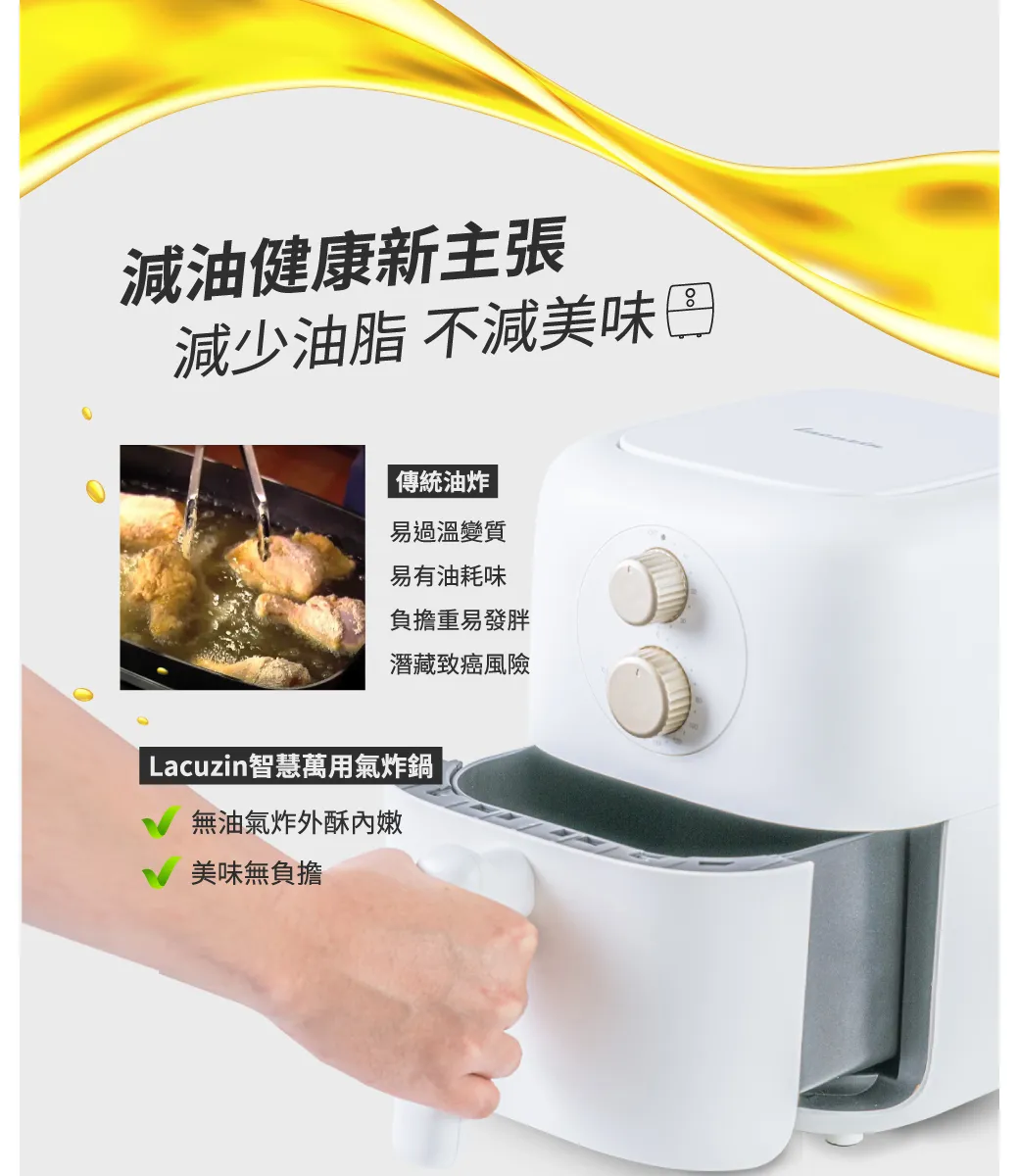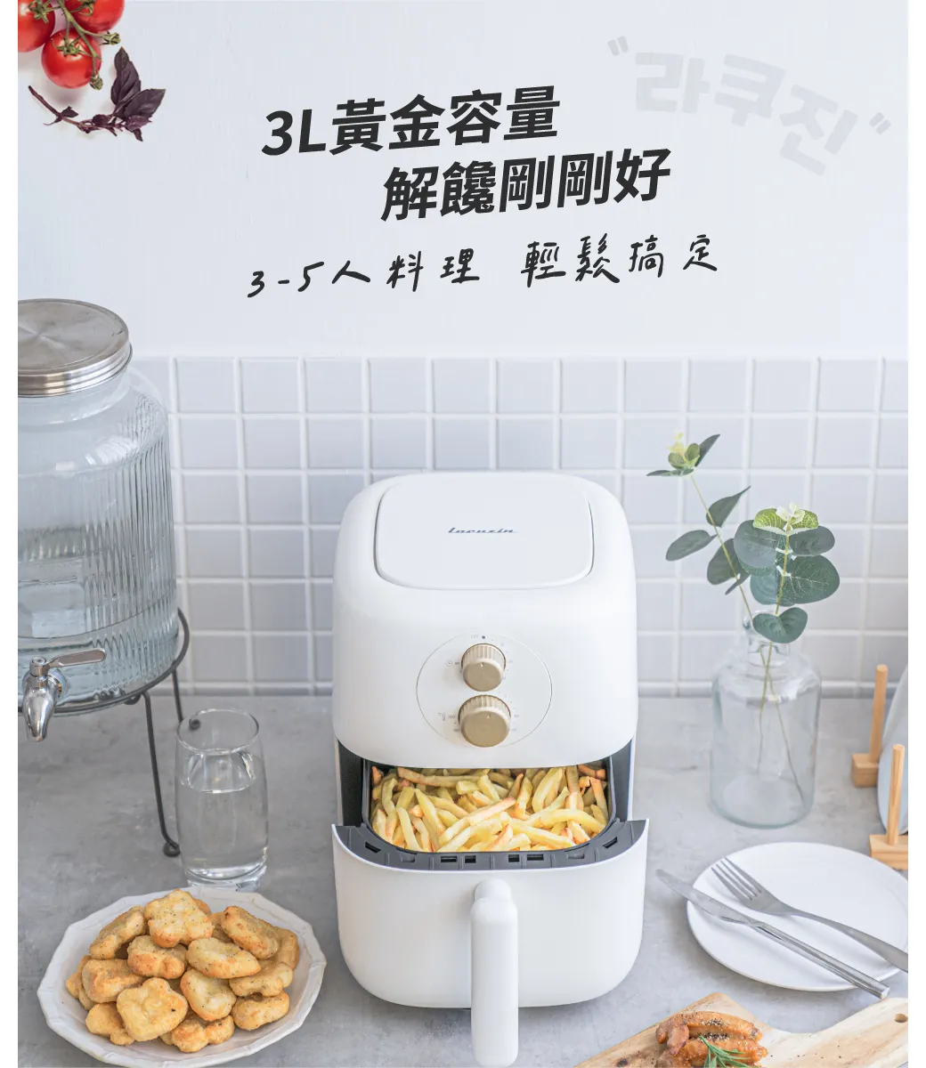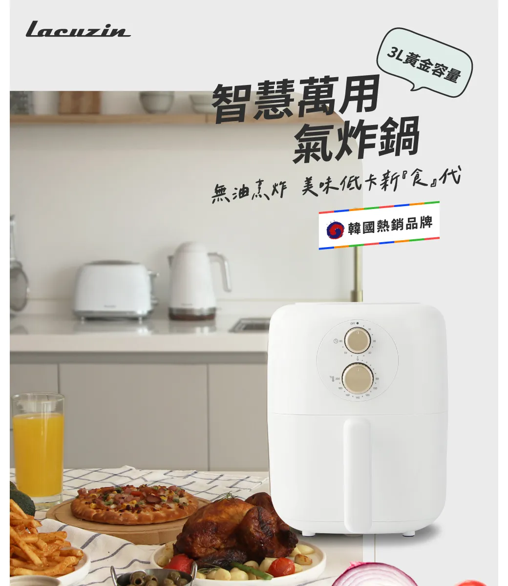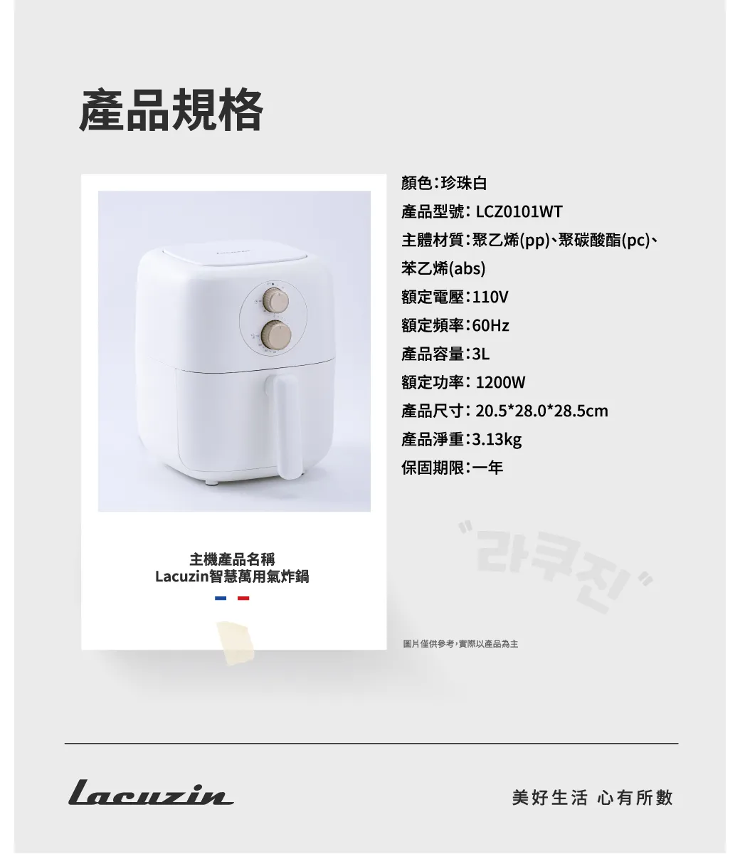 減少油脂 不減美味,健康新主張360度高速熱風循環.無需手動翻面3L黃金容量.不多不少剛剛好.型 號:LCZ0101WT.品 名:Lacuzin 智慧萬用氣炸鍋.顏 色:珍珠白.商品尺寸:約 20.5 x 28 x 28.5 cm.商品重量:約 3.13 kg.電線長度:約 80 cm (不含接頭).額定電壓:AC110V.額定頻率:60Hz.額定功率:1200W.容 量:3L.產品材質:聚乙烯(pp)、聚碳酸酯(pc)、苯乙烯(abs).包裝內含:主機 x1、炸籃 x1.商檢字號:R3A903 RoHS.產 地:中國