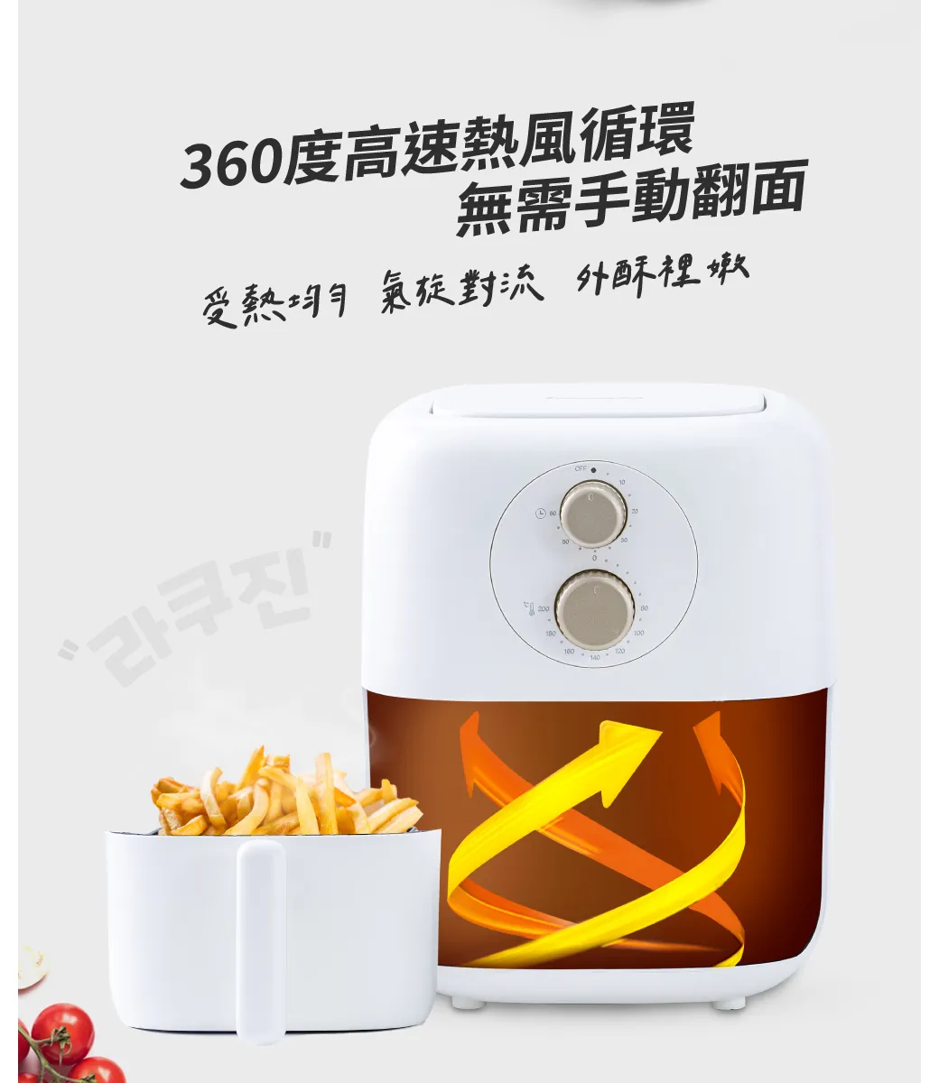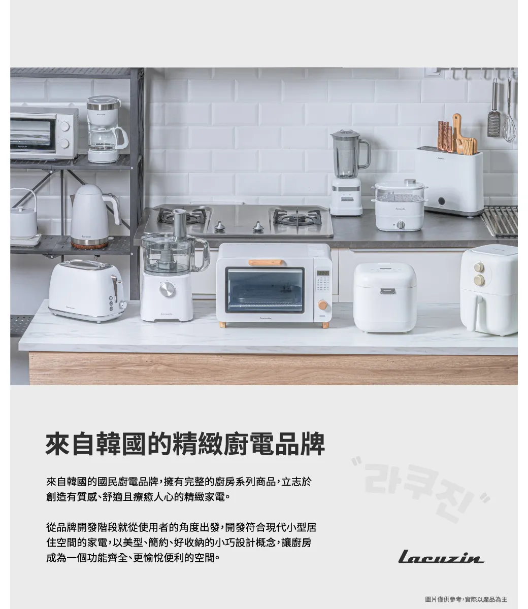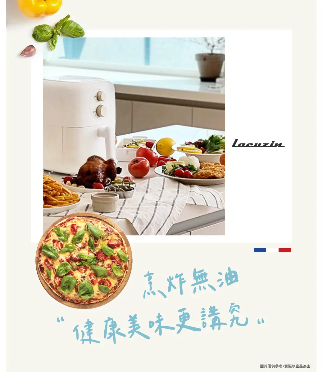 減少油脂 不減美味,健康新主張360度高速熱風循環.無需手動翻面3L黃金容量.不多不少剛剛好.型 號:LCZ0101WT.品 名:Lacuzin 智慧萬用氣炸鍋.顏 色:珍珠白.商品尺寸:約 20.5 x 28 x 28.5 cm.商品重量:約 3.13 kg.電線長度:約 80 cm (不含接頭).額定電壓:AC110V.額定頻率:60Hz.額定功率:1200W.容 量:3L.產品材質:聚乙烯(pp)、聚碳酸酯(pc)、苯乙烯(abs).包裝內含:主機 x1、炸籃 x1.商檢字號:R3A903 RoHS.產 地:中國