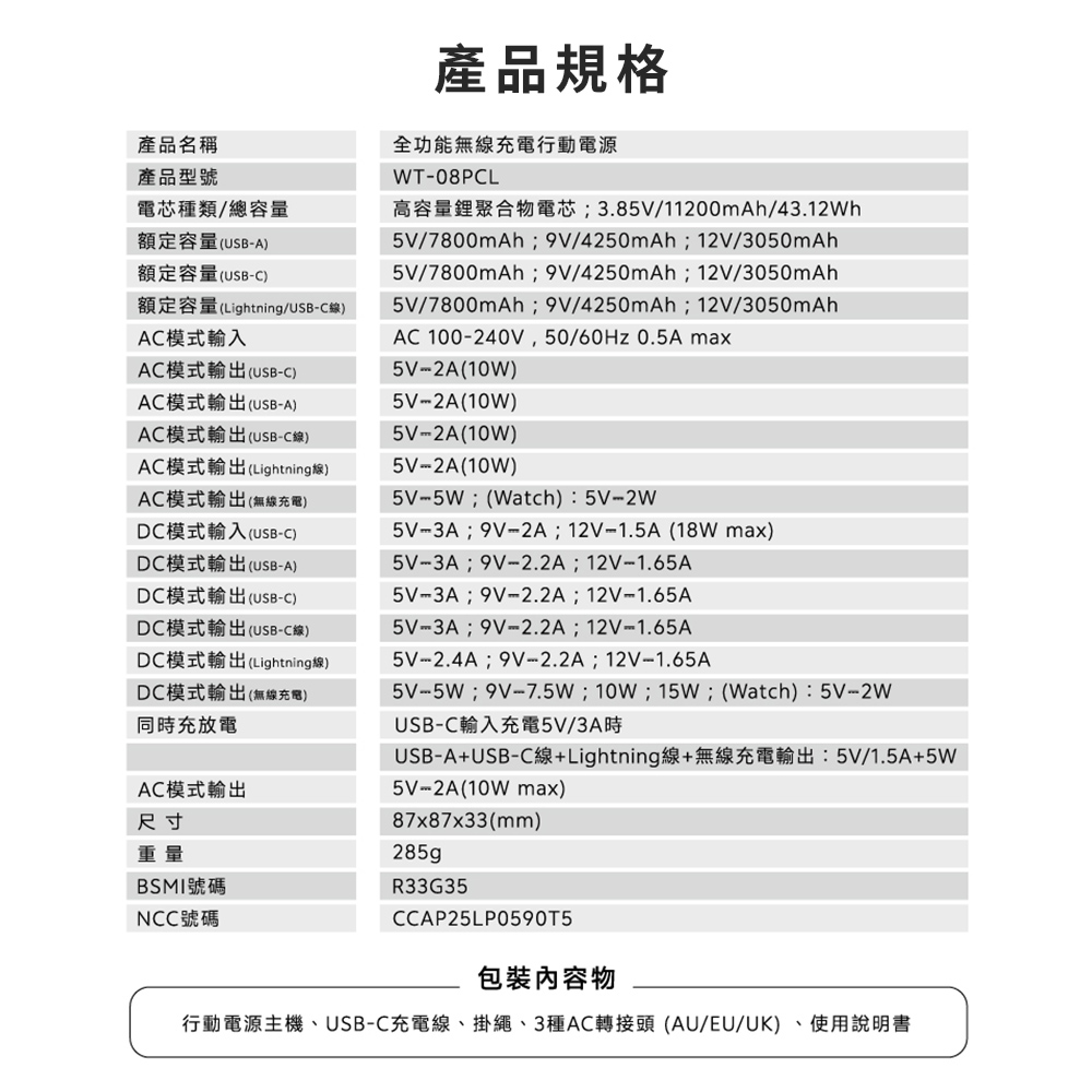 【LaPO】3.5代 全功能無線充電行動電源 11200mAh WT-08P - 沉靜綠(自帶線:Type-C+Lightning )