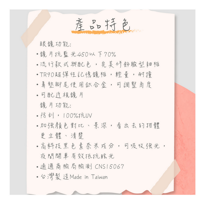 TR90超彈性記憶鏡框無螺絲結構設計PC強化鏡片防刮耐撞擊100%抗UV