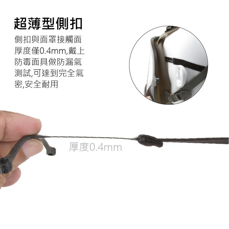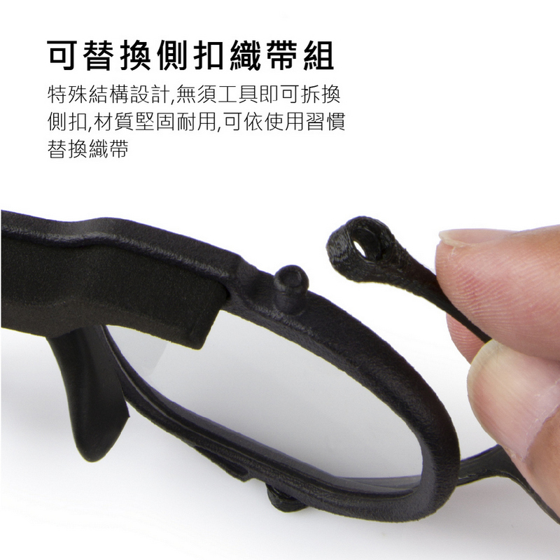 可裝配度數鏡片可戴在軍警空氣呼吸器面罩/防毒/漆彈面罩/雪鏡/安全帽/防護面罩密合性高,不易滑落側扣易拆,可以更換不同材質的織帶所有的配件都可以輕易拆下,更換新的