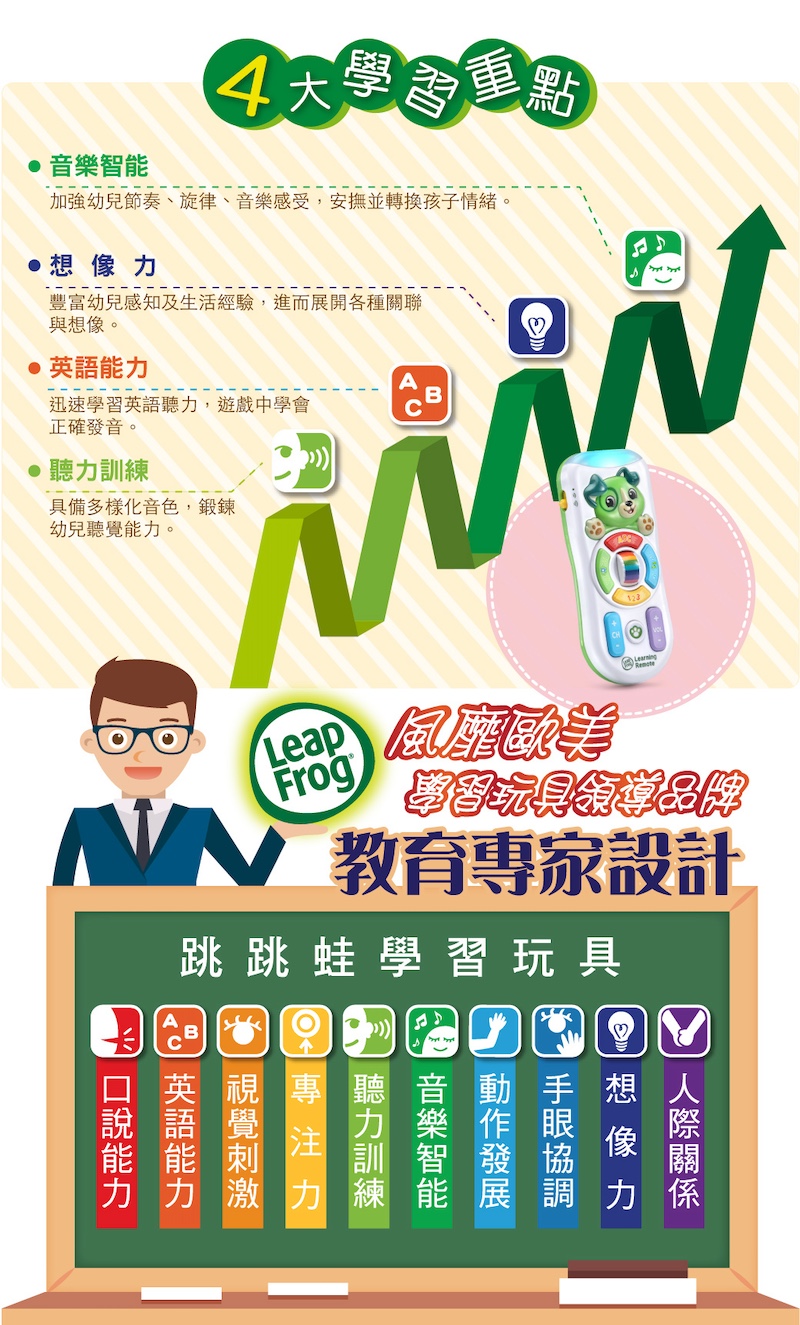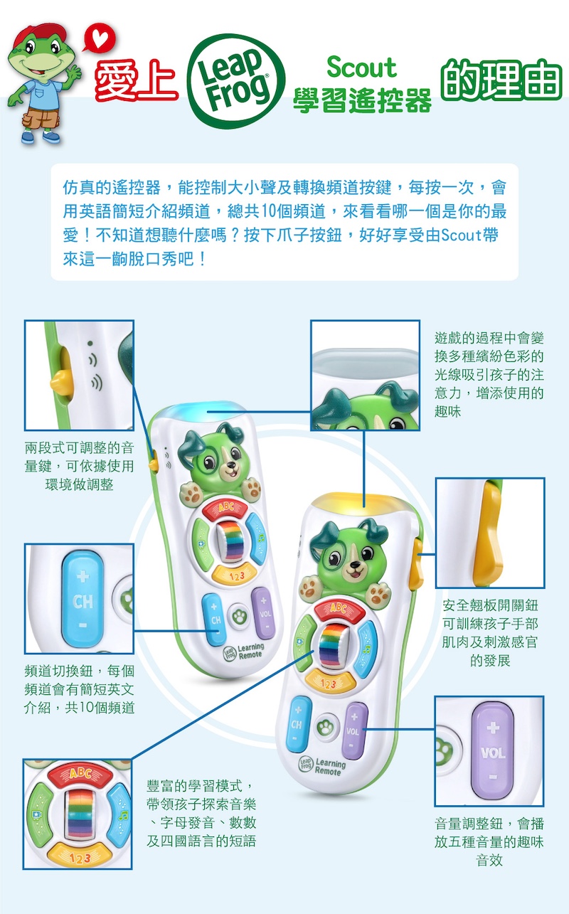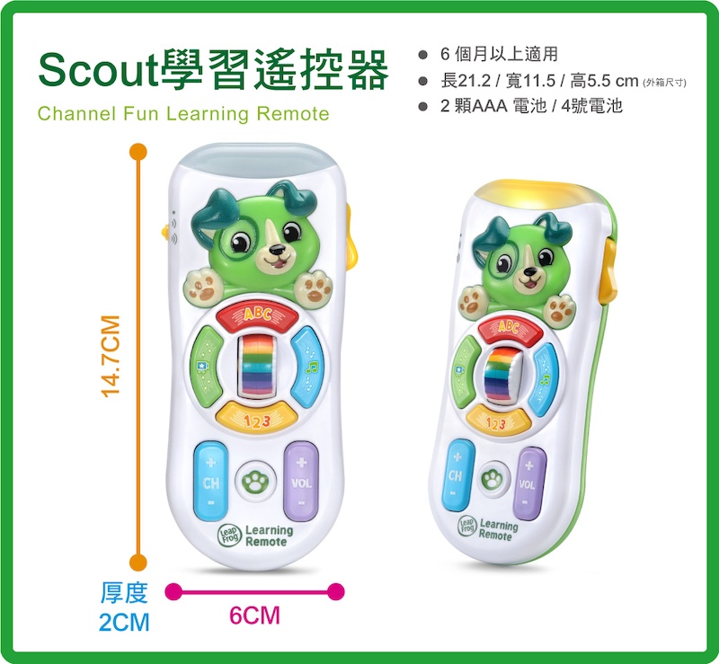 ●學習遙控器共9個按鈕,聆聽 100 多個短語,同時增強手部力量和協調性●仿真遙控器,能控制大小聲及轉換頻道按鍵,每轉一個頻道,會用英語簡短介紹頻道●四個頻道按鍵,頻道中探索英文字母發音、數數、音樂、各國語言的短語●轉動中間彩色滾輪,遙控器依上方跳出的顏色,發出正確的英文單字●多元學習主題-顏色/數數/字母/音樂/手部小肌肉