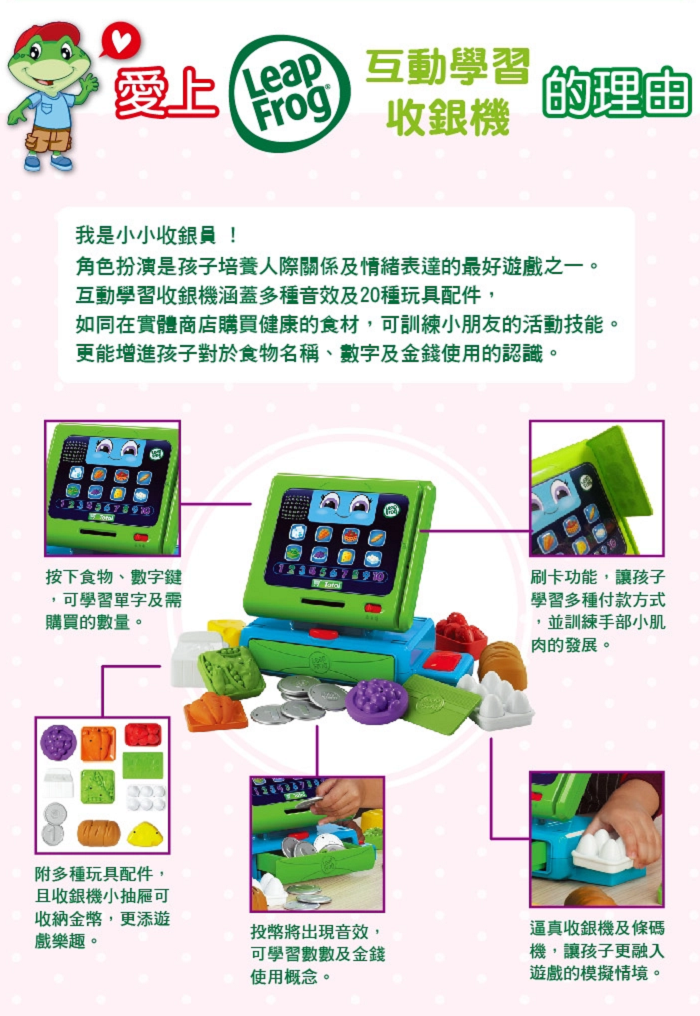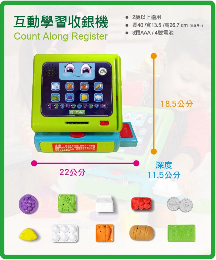 *逼真收銀機,讓孩子更融入模擬情境*投幣將出現音效,可學習數數以及算錢*按下食物鍵、數字,可學習需購買的數量*學習主題-數字/顏色/算數/金錢技能