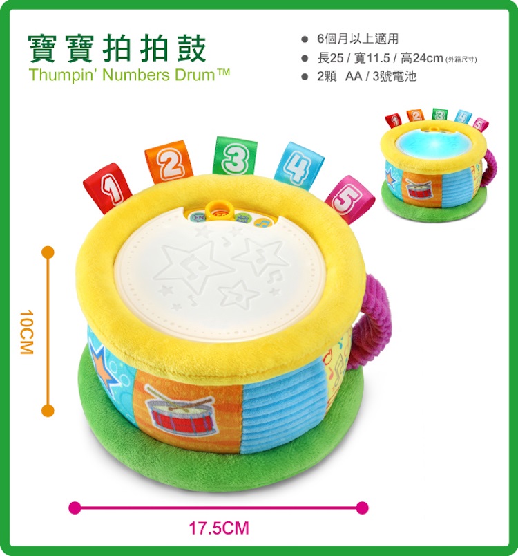 *輕拍鼓時,鼓面顏色會變換。*輕敲鼓的頂部會計數1-10。*可選擇用英語或西班牙互動。*內建 10 多首兒童旋律可跟著拍打。*材質採毛絨紋理面料設計,觸感更佳更安全。*鼓身旁設有手柄,方便抓握。*多元學習主題-動物/顏色/運動技能/數字/形狀。