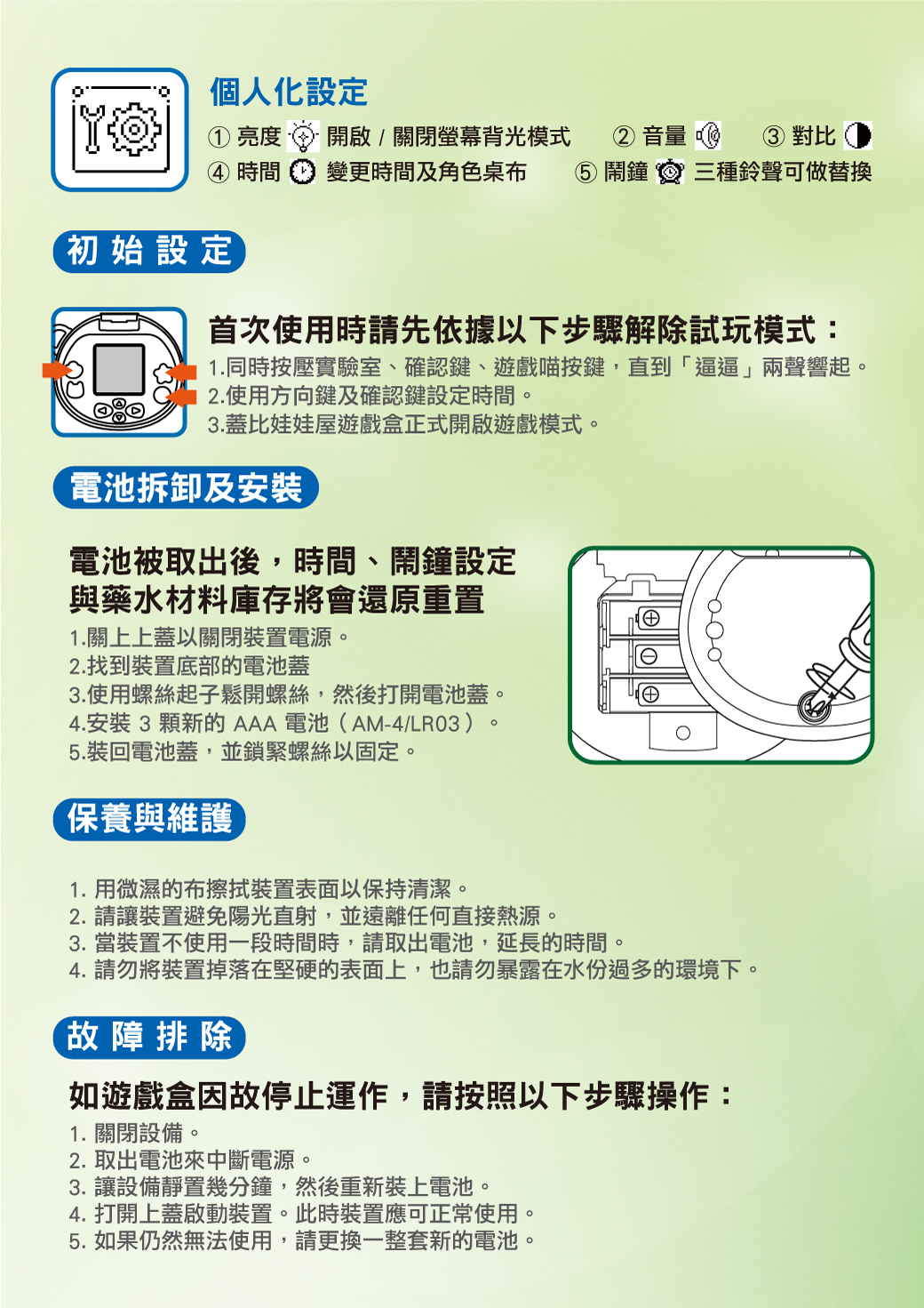 ●三種遊戲模式,分別是遊戲喵、喵朋友、科學藥水按鍵●遊戲喵-遊戲模式:內含形狀辨識、躲貓貓、舞步記憶挑戰,以及井字棋對決等遊戲,有助培養孩子的形狀認知、記憶力與問題解決能力。●科學藥水-製作道具:每完成一個關卡,就能蒐集四種藥水。點選「科學藥水」按鍵後,可透過數數方式,將藥水製作成道具。像是貓咪專用的縮小藥水●喵朋友按鍵 - 每日驚喜互動:每天都有不同的喵朋友登場打招呼,增添遊戲樂趣,讓每一次都充滿新鮮感●遊戲喵-設定模式:可依需求調整音量、亮度、時間、鬧鐘。鬧鐘擁有十款以蓋比和喵喵朋友為主題的桌面風格●遊戲盒輕巧好攜帶,附有掛鉤設計,可輕鬆掛在書包或袋子上,外出玩樂更方便●多元學習主題-數數/數字/記憶力/解決問題/時間/形狀※啟動正常模式:同時按著遊戲喵、科學藥水、確認鍵。聽到逼逼兩聲,即代表已啟動正常模式