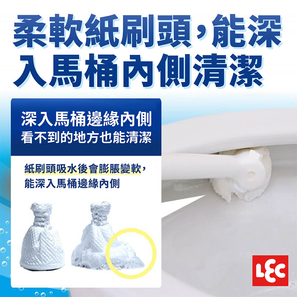 紙刷頭吸水後會膨脹變軟,能深入馬桶邊緣內側,看不到的地方也能徹底清潔。