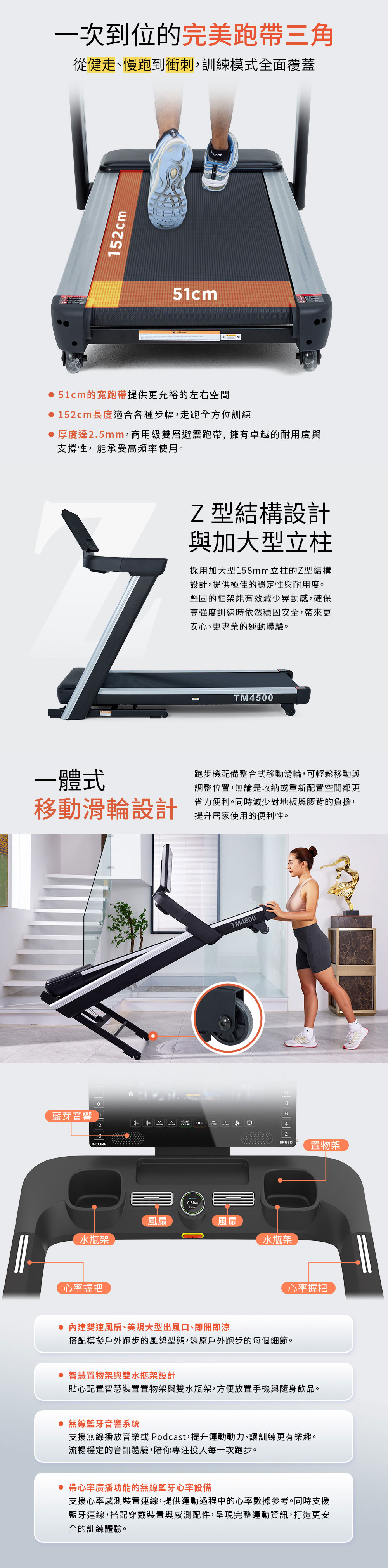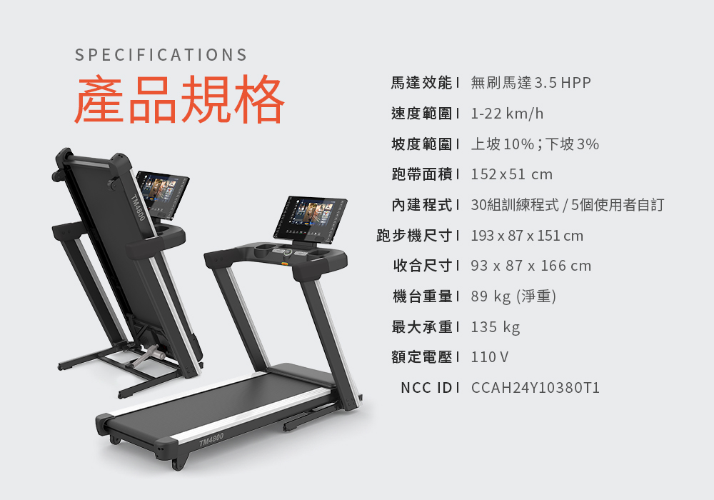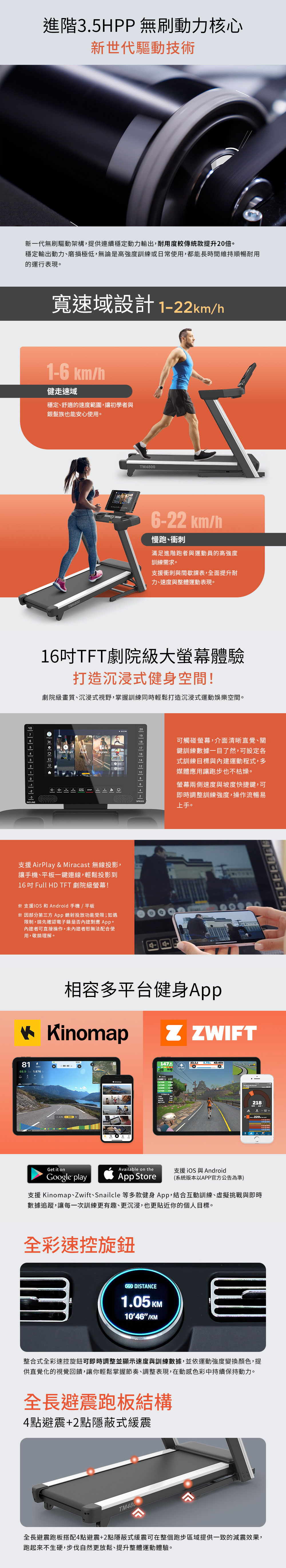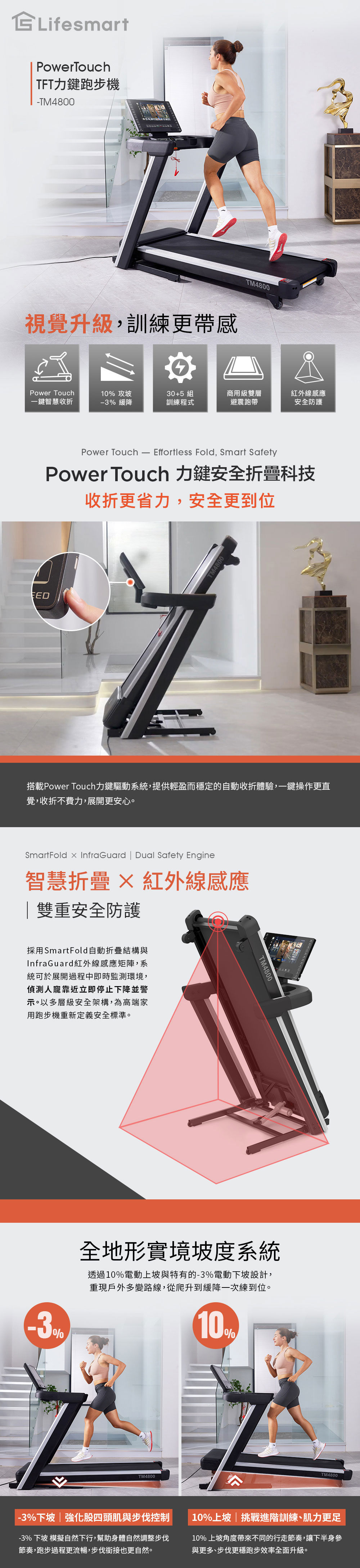 ▲Power Touch 智能收折 直覺操作 安全省力▲InfraGuard 紅外線環境監測 安全升級▲10% 攻坡 × -3% 緩降,完整跑步地圖▲10% 上坡:心肺再升級,腿部更有力▲3% 下坡:強化制動力,步伐更穩定▲3.5HP 精密無刷驅動,穩定動力輸出 ▲寬速域設計;健走、慢跑、衝刺都適合▲商用級避震跑帶,卓越耐用及支撐
