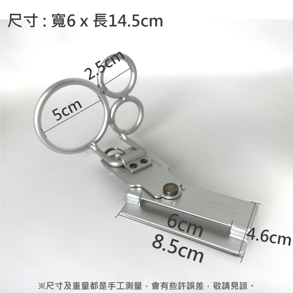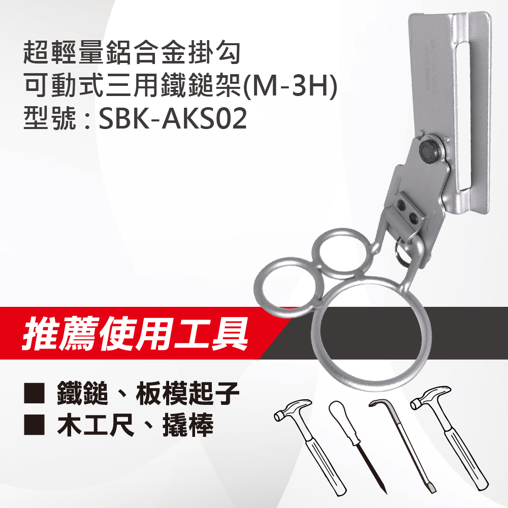 名稱 : 超輕量鋁合金掛勾-可動式三用鐵鎚架(M-3H)型號 : SBK-AKS02重量 : 64g推薦使用工具 : 鐵鎚、板模起子、木工尺、撬棒