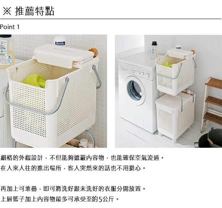 *此商品為【單個】販售*外觀細格紋設計,不但能夠遮蔽內容物,也能確保空氣流通此款附有能折疊的上蓋,不但能在上方放置小東西,拿取內容物也輕鬆提把立起扣下即可向上堆疊同商品或另外無蓋款籃子,更節省空間無論是當洗衣籃或收納籃都方便