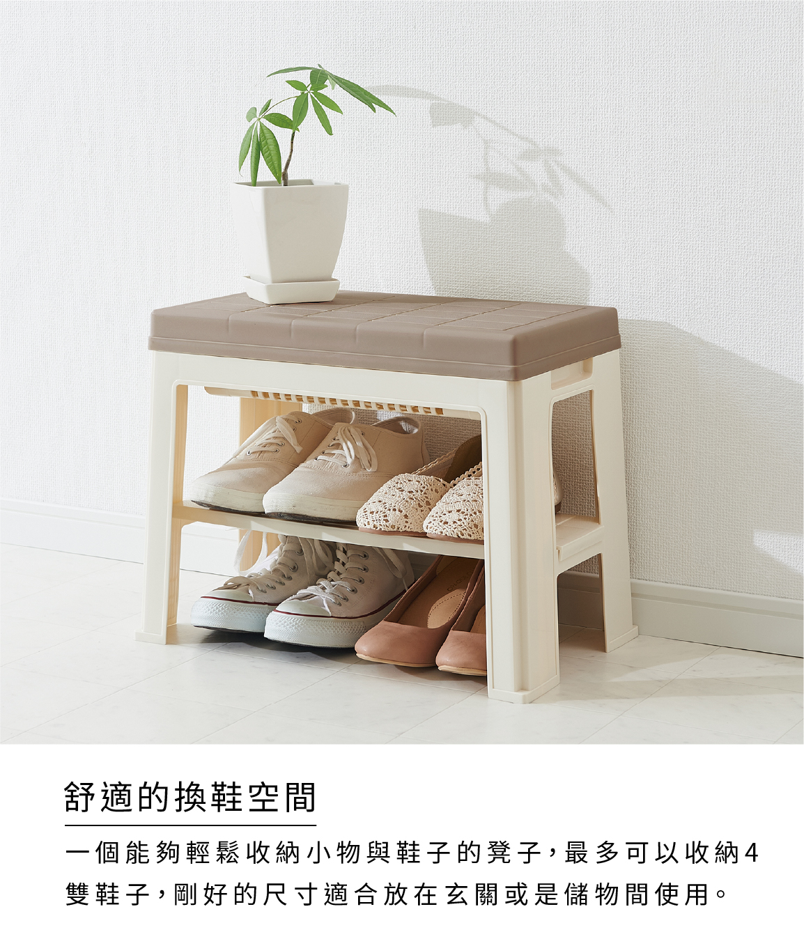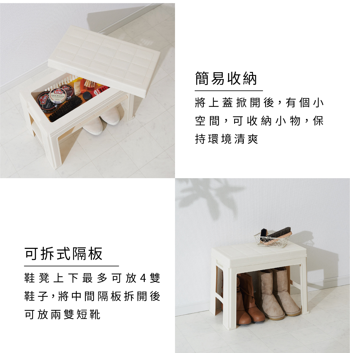 免組裝玄關穿鞋椅將椅墊開啟還有一個小小的儲物空間收納雜物 椅墊下最多可儲放4雙鞋子 隔板拆下後則可收納2雙有點高度的短靴