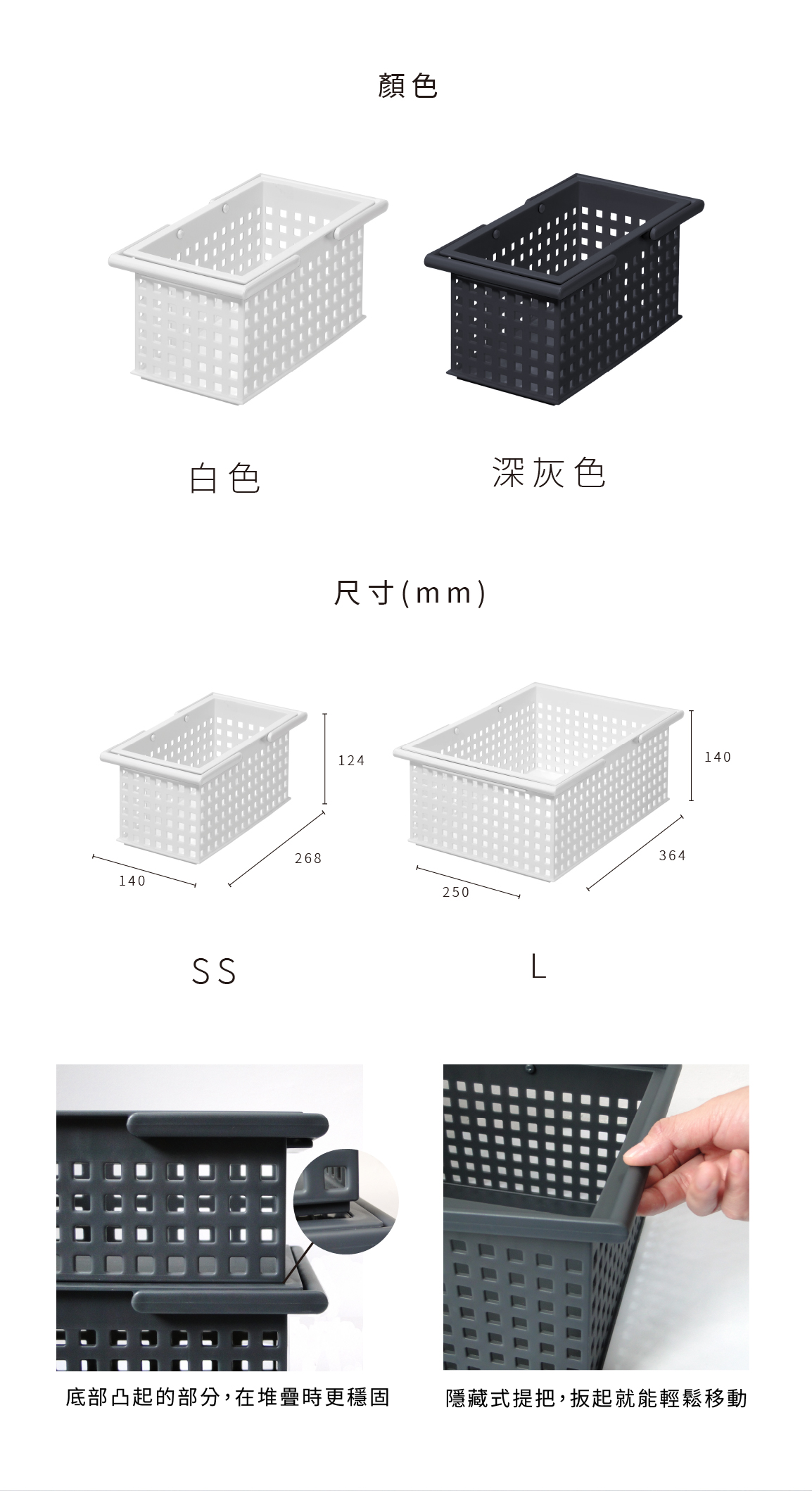 商品規格L 尺寸:(約)寬度364 x深度250 x高度140mm (提起手柄:255mm)L 重量:530±3gSS 尺寸:(約)寬度268 x深度140 x高度124mm (提起手柄:210mm)SS 重量:270±3g顏色:深灰色、白色材質:聚丙烯製造地:日本