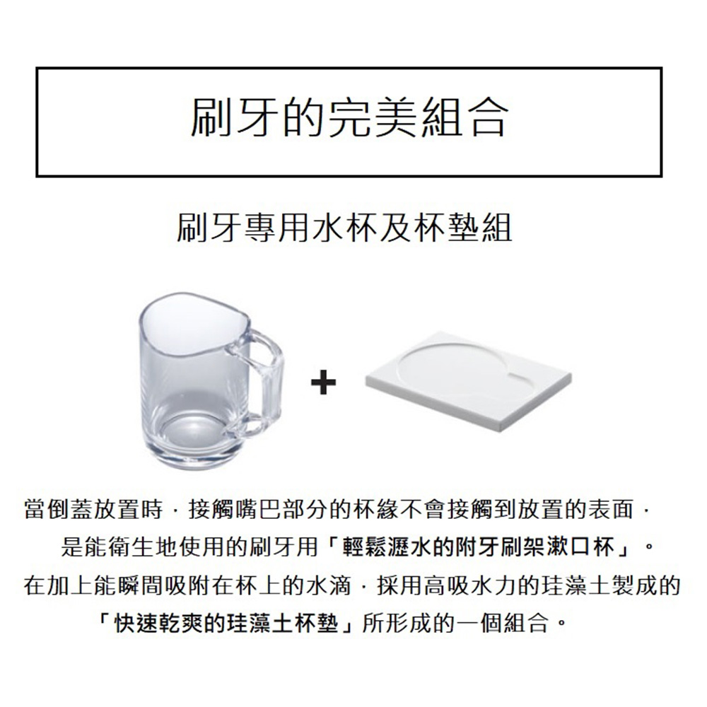 漱口杯杯緣彎曲曲線設計,向下倒蓋能快速將水瀝乾接觸口的地方不直接觸碰檯面又衛生握把處設計成可放置牙刷或小型電動牙刷的架子,使用更方便珪藻土杯墊能瞬間吸附水杯上的水滴,保持乾爽再加上底部腳墊設計,於檯面間有空間能保持通風※此款內容物包含:瀝水漱口杯(透明白款)*1+吸水珪藻土杯墊*1