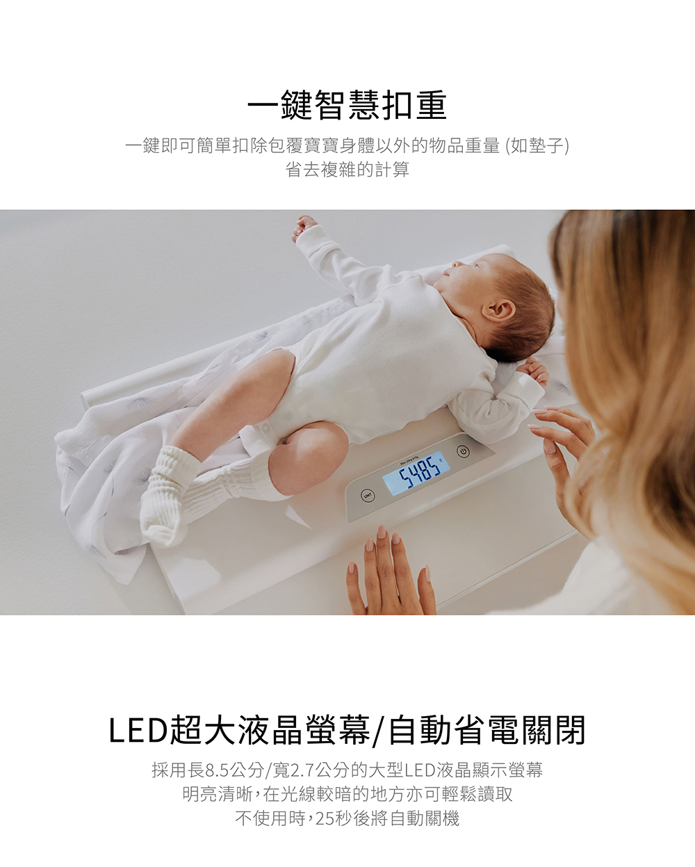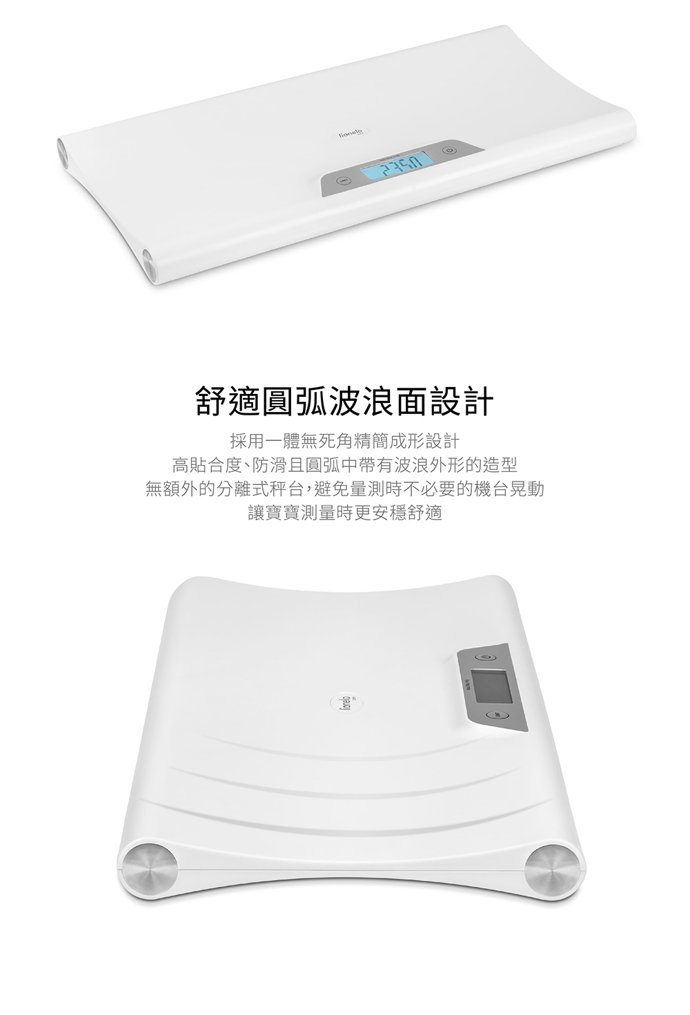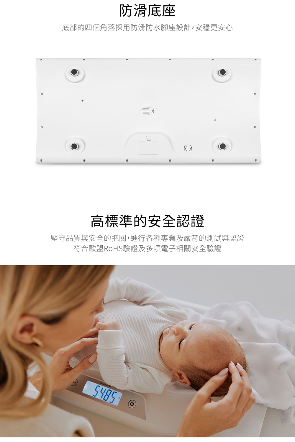 專為新生兒設計,無論是日常紀錄,還是哺乳寶寶的體重監控,都能協助爸媽更安心、科學化育兒。讓您在家中也能輕鬆掌握體重變化,搭載高精度感測器與數位顯示螢幕,即時顯示寶寶體重,即使每天微小的變化也能清楚掌握。秤面加寬加長、防滑設計,寶寶躺著、坐著都舒適穩固不易滑動。