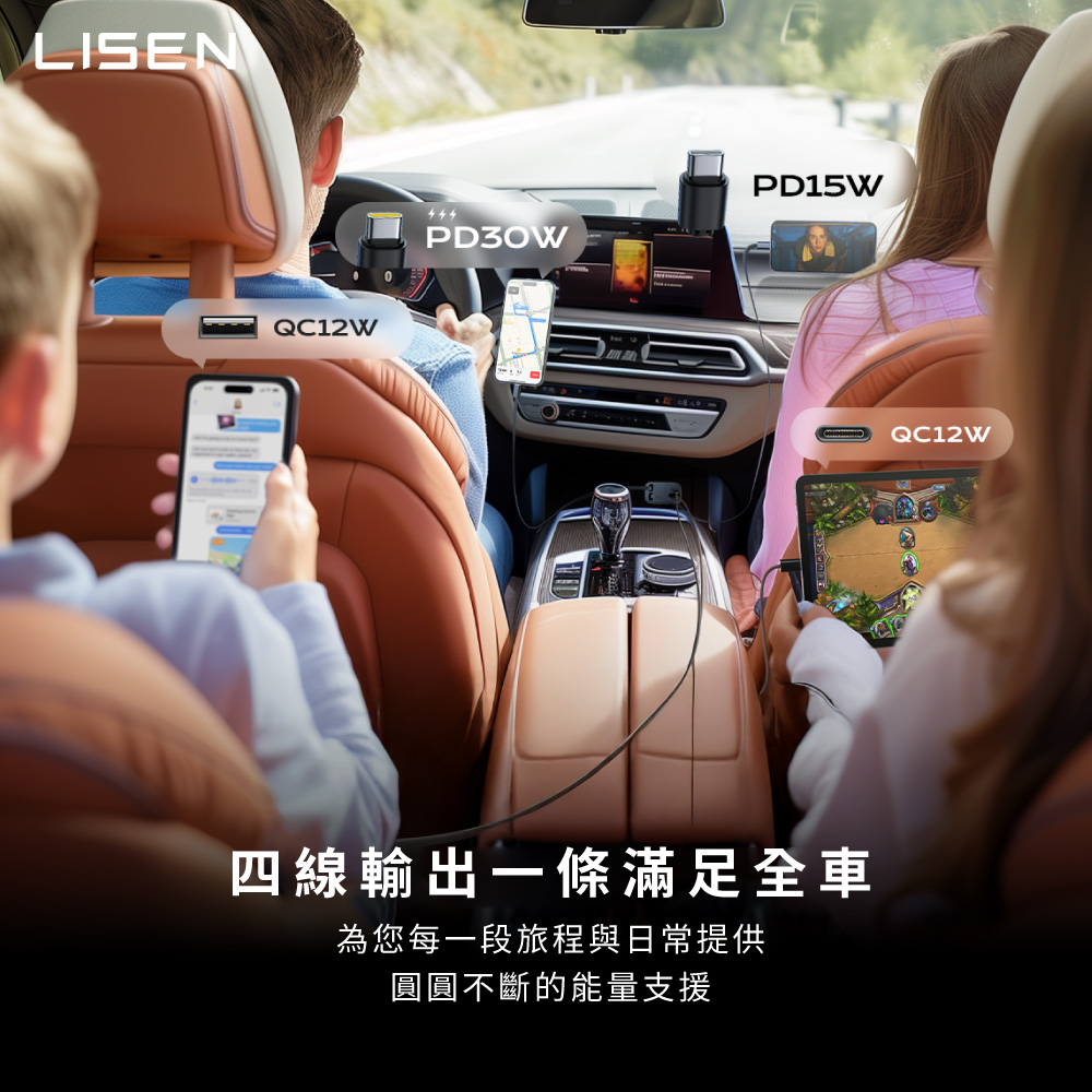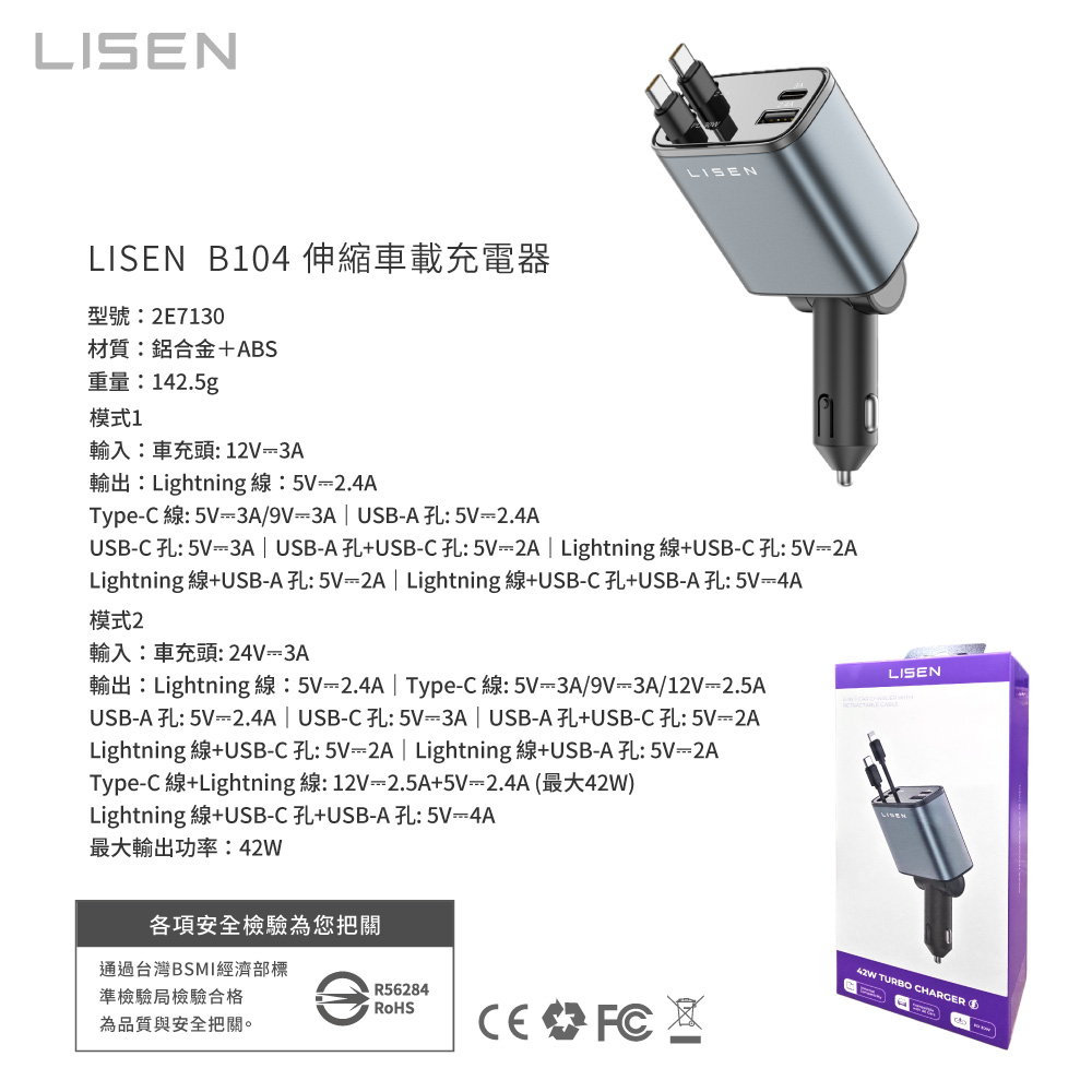 ● 2自帶線+2追加孔位,一顆就夠● ABS阻燃材料,安全可靠● 精密構造,超過萬次抽拉測試● 180°旋轉調解,給你完美角度LISEN B104 伸縮車載充電器型號:2E7130材質:鋁合金+ABS重量:142.5g模式1輸入:車充頭:12V/3A輸出:Lightning線:5V:2.4AType-C線:5V/3A ,9V/3A|USB-A孔:5V/2.4AUSB-C孔:5V/3A|USB-A孔+USB-C孔:5V/2A|Lightning線+USB-C孔:5V/2ALightning線+USB-A孔:5V/2A|Lightning線+USB-C孔+USB-A孔:5V/4A模式2輸入:車充頭:24V/3A輸出:Lightning線:5V/2.4A|Type-C線:5V/3A ,9V/3A ,12V/2.5AUSB-A孔:5V/2.4A|USB-C孔:5V/3A|USB-A孔+USB-C 孔:5V/2ALightning線+USB-C孔:5V/2A|Lightning線+USB-A孔:5V/2AType-C線+Lightning線:12V/2.5A+5V/2.4A(最大42W)Lightning線+USB-C孔+USB-A孔:5V/4A最大輸出功率:42WBSMI:R56284