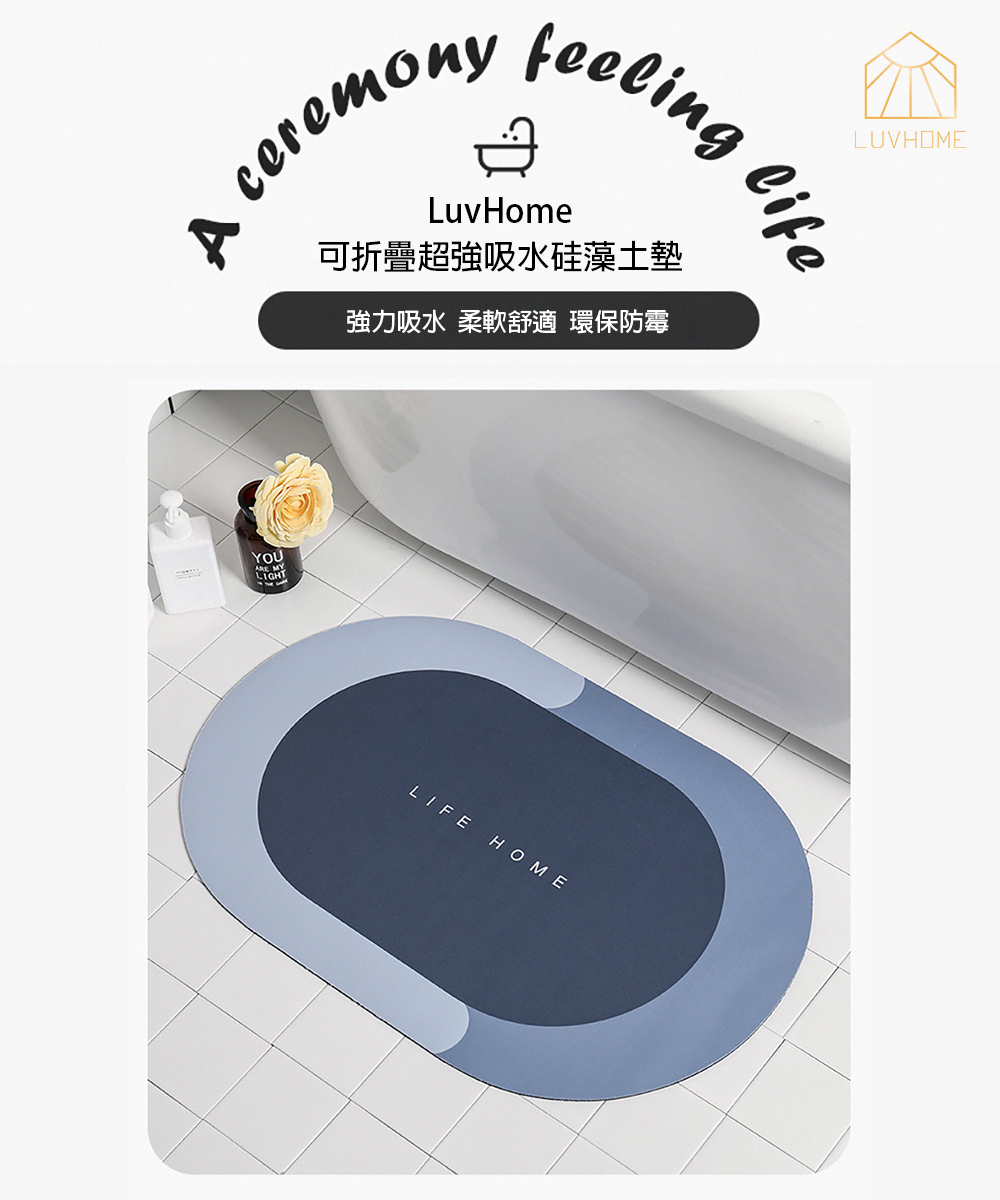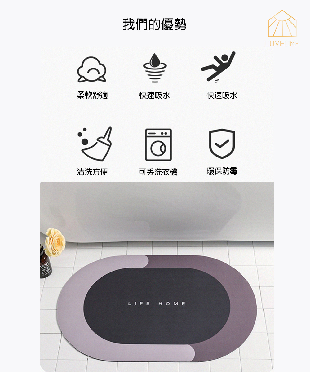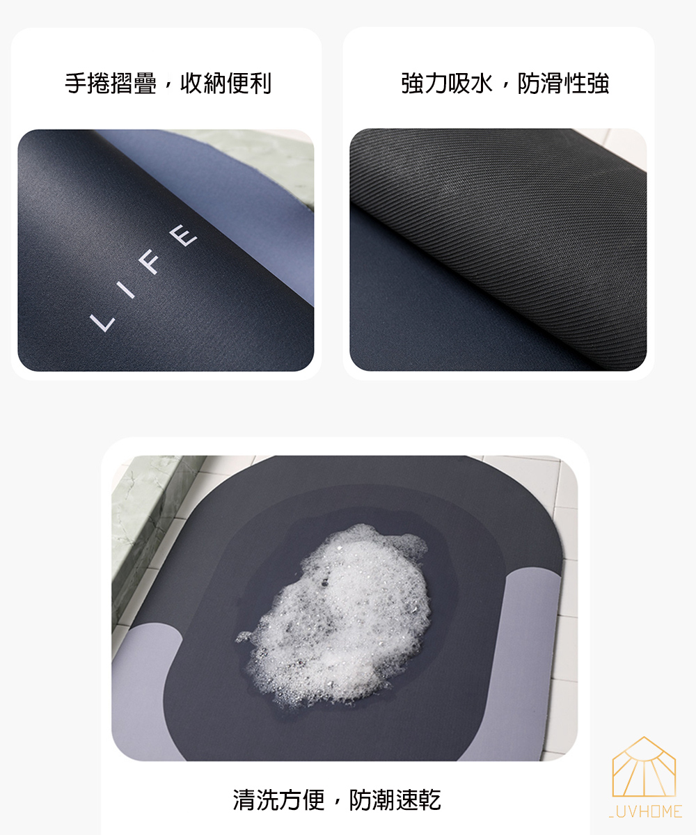 告訴您珪藻土的優勢,能快速吸收水分快速蒸發,防滑性強不怕滑倒,也能減少細菌孳生。地墊清洗方便,也能摺疊收納、輕鬆掛曬。多種顏色選擇,營造舒適生活。