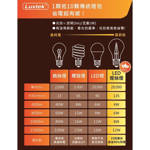 【Luxtek LED燈絲燈】 您的照明優選!💡LED燈絲燈泡,能效大躍進,歐美節能新寵,激省照明用電90%。💡輕鬆汰換耗能燈具-傳統LED燈泡、螺旋燈泡、鹵素燈、鎢絲燈。💡美觀優雅,增添璀璨氛圍,適用於美術燈、水晶燈、壁燈、檯燈等室內燈具。【LED燈絲燈泡 革新技術 完勝優勢】📢◆ A++歐洲最高能源效益標準,超高光效(光效遠超越市售LED燈泡35%、螺旋燈泡55%、鹵素燈90%)◆ 兩萬小時高壽命,一顆抵10顆鎢絲燈、4顆螺旋燈泡◆ 全視角發光,光線均勻明亮◆ 高演色指數,不色偏◆ 不閃頻,減緩視覺疲勞◆ 無藍光危害,無紫外線釋出,保護眼睛皮膚◆ 不含汞鉛,低廢棄物,環保愛地球 【綠色聰明消費3大秘訣,省電省荷包💰】㊙秘訣1:燈泡亮度看流明,不是看瓦數。㊙秘訣2:省電看光效(lm/W),愈高愈省電。㊙秘訣3:選有CNS認證及保固產品,使用安心有保障。【產品規格】◆ 品牌:Luxtek 樂施達◆ 型號:ST64C WW6.5W E27 100-240V 2700K◆ 額定功率 (W):6.5 瓦◆ 光通量 (lm):810 流明◆ 發光效率 (lm/W):125 流明/瓦◆ 額定電壓 (V):AC 100-240 V◆ 適用燈座:E27◆ 玻璃燈罩:清光◆ 額定色溫 (K):2700K 黃光◆ 尺寸 ø×H (mm):64×143 mm◆ 不可調光/可調光:不可調光◆ 演色性:≥80◆ CNS號:CI746061710079◆ BSMI:R74171◆ 保固:2年(非人為損壞情況下)*以上如有誤值,請以實際物品規格為主👀【購物注意事項】※ 若人為因素損壞、拆封,皆不可退換貨!☑️ 出貨時間:約1-3個工作天,盡量以最快速度出貨 (不含假日、國定假日)。👀【商品注意事項】※ 適用於-20~+40度C的室內使用環境※ 本產品不適用可調光式燈具※ 請勿將燈泡用於密封式燈具或戶外使用※ 請使用符合本產品電器規範之電源※ 換裝燈泡前,請關閉電源,並保持燈泡乾燥,以策安全※ 文字敘述如有錯誤本公司不負法律責任,本公司有最終解釋權 #Luxtek #LED燈絲燈 #CNS認證 #兩年保固 #節能 #省電 #減碳 #環保 #無汞 #Rohs #白光 #黃光 #木瓜燈 #愛迪生燈 #水晶燈 #美術燈 #工業風 #復古風 #LOFT