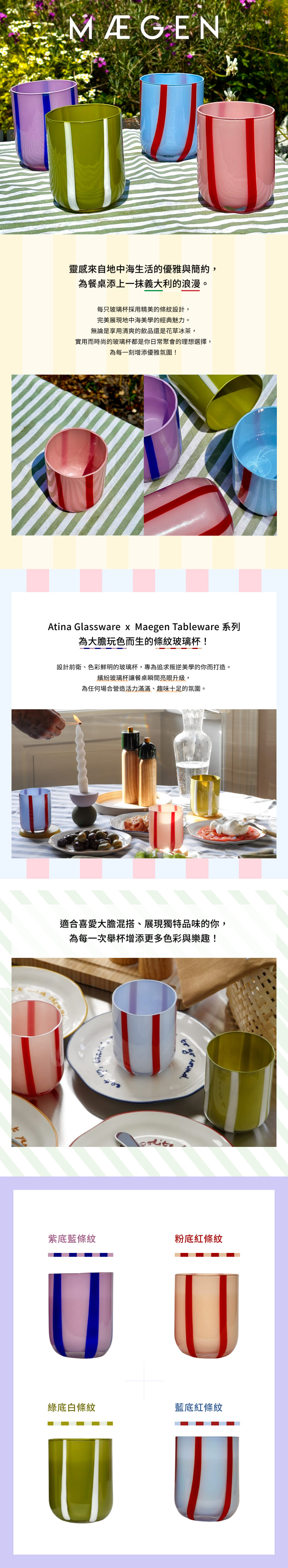 靈感源自地中海生活的優雅與簡約,大膽色彩 × 經典條紋為餐桌注法式浪漫。無論清爽飲品或花草冰茶, 這只兼具設計與機能的玻璃杯,都能為每一次舉杯創造話題。