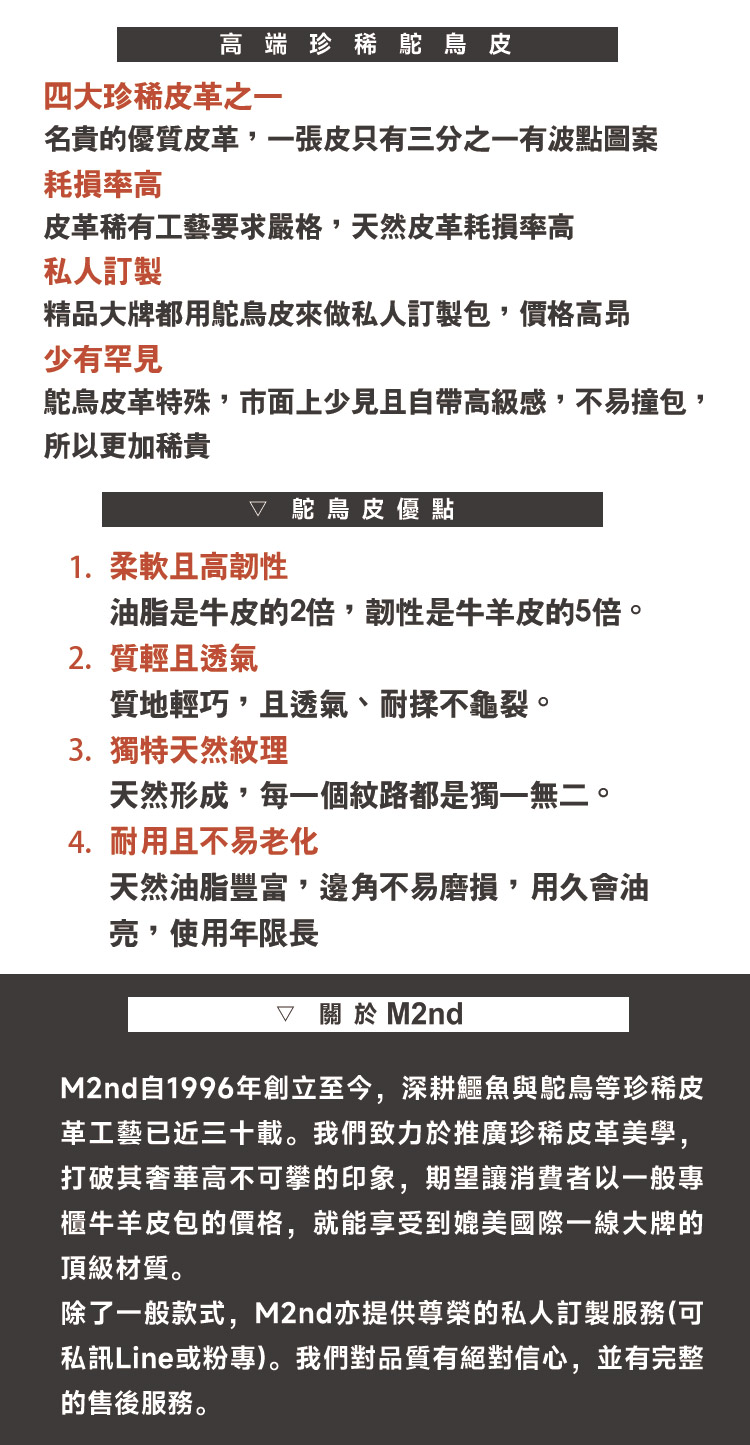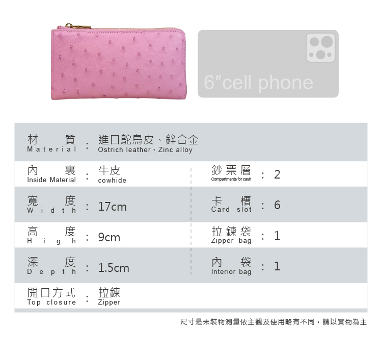 材質:進口鴕鳥皮+五金扣環尺寸:17*9*1.5 cm配件:保固卡*1※備註:預購商品,請以系統出貨日為主※其他:一年保固,新品瑕疵※鴕鳥皮屬於天然珍稀皮革,每一只包都有獨特的天然動物紋路※商品照片僅供參考 請以實品為主※尺寸是未裝物測量依主觀及使用略有不同,請以實物為主