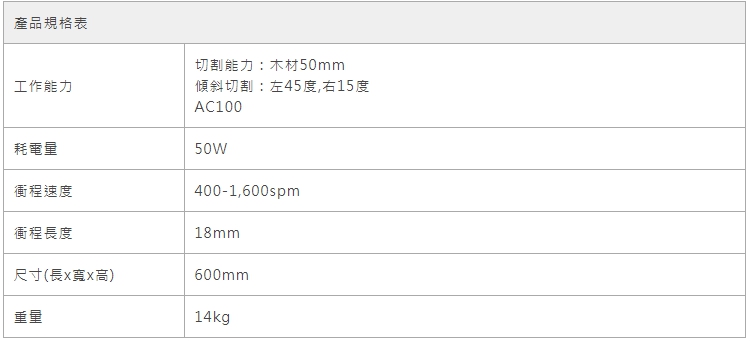 ‧切割能力:木材 50 mm軟鋼板 - mm傾斜:左45度/右15度‧衝程速度:400-1,600 spm (次/分)‧衝程長度:18 mm‧耗電量:50 W