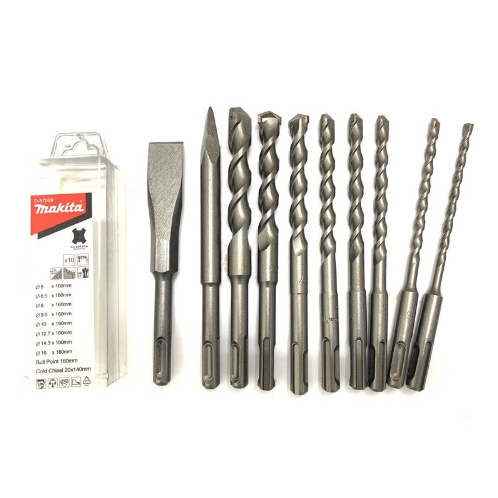 MAKITA牧田 D-57059 四溝鑽頭 10件組合 鑽頭 四溝規格:5mm x160mm6.5mm x160mm8mm x160mm9.5mm x160mm10mm x160mm12.7mm x160mm14.3mm x160mm16mm x160mm四溝尖鑿x160mm四溝平鑿x140mm