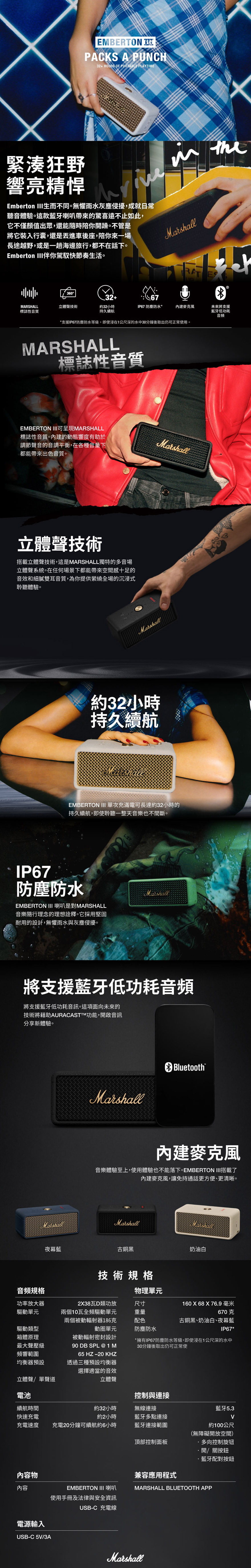 商品規格︰■型號:Marshall Emberton III■保固:一年+到貨7日內線上登錄增加半年保固■產地:中國■貨源:台灣公司貨■尺寸:68 x 166 x 76.9 mm■重量:670公克■防水防塵等級︰IP67■電源輸入端口:USB-C 5V/3A■無線連接:藍牙5.3■藍牙多點連接︰有■藍牙連接範圍︰約100公尺(無障礙開放空間)■電池續航時間:約32小時■快速充電:2小時■充電速度:20分鐘提供6小時電力■驅動單元:2個10瓦全頻區域單元、2個被動輻射器186克■功率放大器:2個38瓦D類功放■驅動類型︰動圈單元■最大聲壓級:90 dB■頻響範圍︰65HZ-20KHZ■均衡器預設︰透過三種預設均衡器,選擇適當的音效■立體聲/單聲道︰立體聲■NCC︰CCAJ24LP0860T5■BSMI︰R38900~2027.01.24■配件/內容物:Emberton III攜帶式藍牙喇叭、使用手冊及法律與安全資訊、USB-C 充電線注意事項︰*民法第259條第六項:【買家一旦拆封使用後】應返還之物有毀損、滅失或因其他事由,致不能返還者,應償還其價額,我方將會酌收相應費用。1. 此商品為影音用品,拆封後不做退換貨。7天鑑賞期內若要退換貨,須把商品恢復原狀。否則將會酌收整新費!2. 退貨商品之包裝及內容物均須完整無破損,否則恕無法接受退換貨3. 產品顏色會因網頁呈現而有些許差異,以收到實品為準