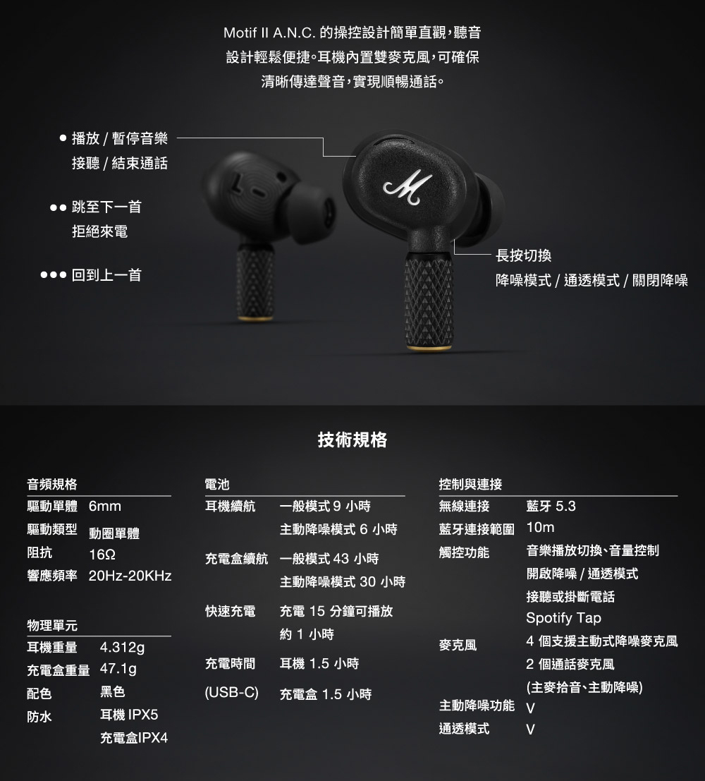 ☆商品規格︰■品牌︰英國■型號:Marshall Motif II A.N.C.■保固:一年(+線上登錄半年保固)■產地:中國■貨源:公司貨■重量:耳機4.312g,充電盒47.1g■防水系數︰耳機IPX5 / 充電盒 IPX4■電池︰耳機續航一般模式9小時、主動降噪模式6小時■充電盒續航一般模式43小時、主動降噪模式30小時■快速充電︰充電15分鐘最多可使用1小時■充電時間(USB-C)︰耳機1.5小時、充電盒1.5小時■充電方式︰無線充電,Type C■驅動單體尺寸:6mm動圈式■阻抗:16 Ohm■響應頻率:20 Hz - 20 kHz■連線方式︰藍牙5.3■藍牙連接範圍︰10公尺■觸控功能︰音樂播放切換、音量控制、開啟降噪/通透模式、接聽或掛斷電話、Spotify Tap■麥克風︰4個支援主動式降噪麥克風,2個通話麥克風(主麥拾音、主動降噪)■兼容應用程式︰Marshall Bluetooth APP■NCC認證碼:耳機CCAN23LP0390T0,充電盒CCAN23LP0400T3■包裝/內含配件︰Motif II A.N.C.真無線藍牙耳機+充電盒、多尺寸耳塞、Type C充電線、使用手冊*注意事項︰*民法第259條第六項:【買家一旦拆封使用後】應返還之物有毀損、滅失或因其他事由,致不能返還者,應償還其價額,我方將會酌收相應費用。1. 此商品為個人貼身用品,拆封後不做退換貨。7天鑑賞期內若要退換貨,須把商品恢復原狀。否則將會酌收整新費!2. 退貨商品之包裝及內容物均須完整無破損,否則恕無法接受退換貨3. 產品顏色會因網頁呈現而有些許差異,以收到實品為準