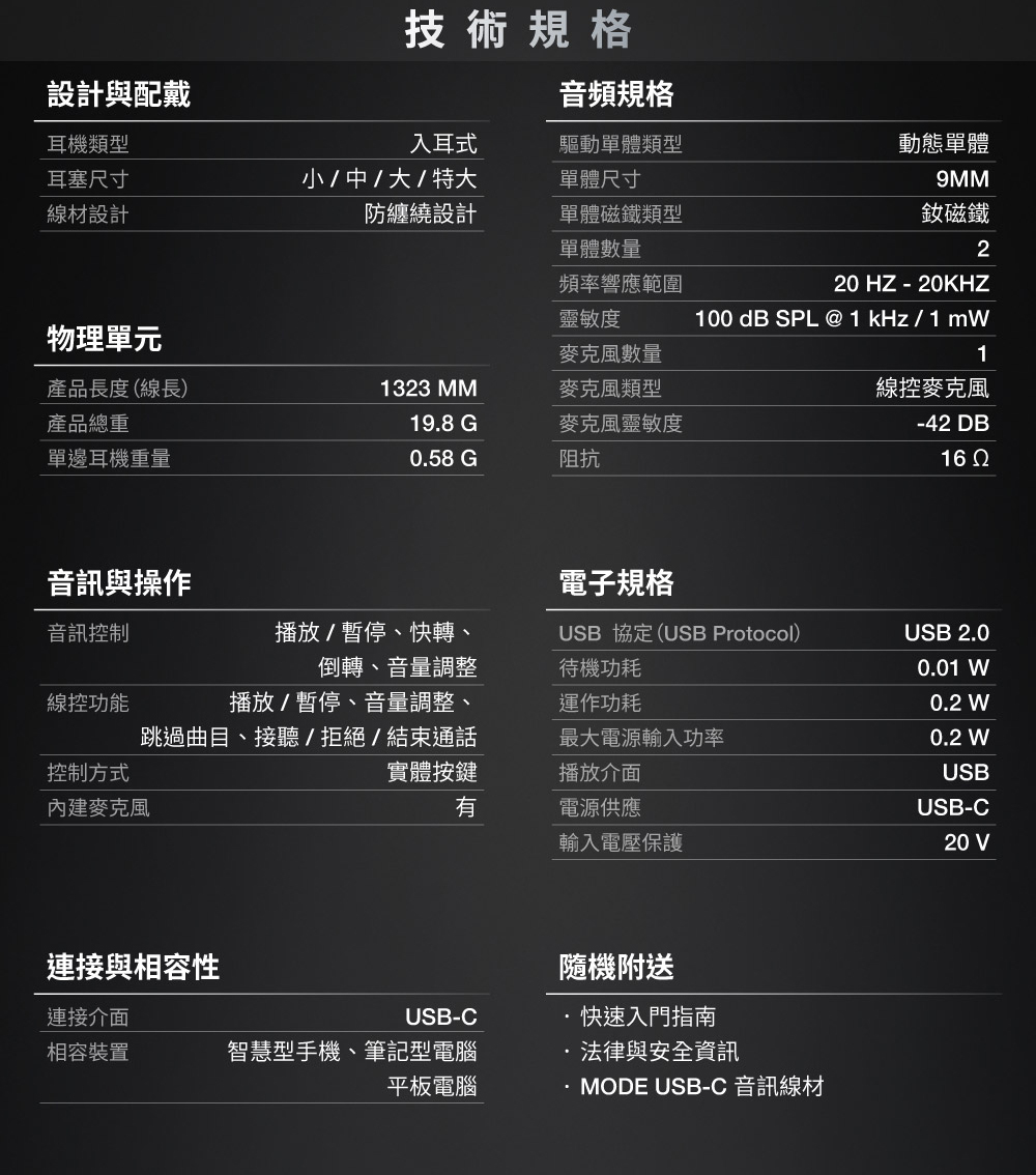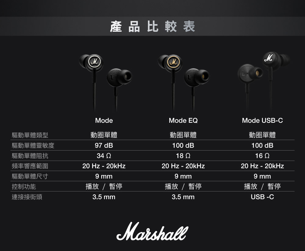 *商品規格:■品牌︰英國■型號:Marshall Mode USB-C■保固:一年+到貨7日內線上登錄延長半年保固■產地:中國■貨源:公司貨■重量:19.8g■連接介面︰USB C■驅動單體類型︰動態單體■單體尺寸:9mm■單體數量︰2■阻抗:32 Ohm■響應頻率範圍:20 Hz - 20 kHz■靈敏度︰100dB SPL@1 kHz/1 mW■麥克風數量︰1個■BSMI︰R38900~2028.09.22■包裝/內含配件︰Mode USB-C音訊線材、快速入門指南及法律與安全訊息*注意事項︰*民法第259條第六項:【買家一旦拆封使用後】應返還之物有毀損、滅失或因其他事由,致不能返還者,應償還其價額,我方將會酌收相應費用。1. 此商品為個人貼身用品,拆封後不做退換貨。7天鑑賞期內若要退換貨,須把商品恢復原狀。否則將會酌收10%~30%整新費!2. 退貨商品之包裝及內容物均須完整無破損,否則恕無法接受退換貨3. 產品顏色會因網頁呈現而有些許差異,以收到實品為準