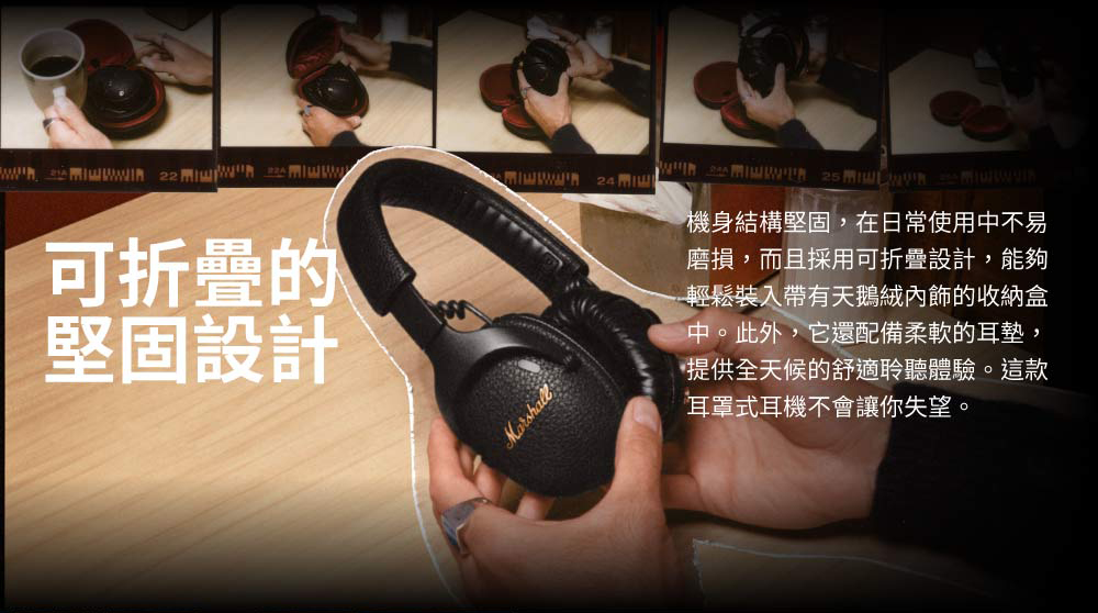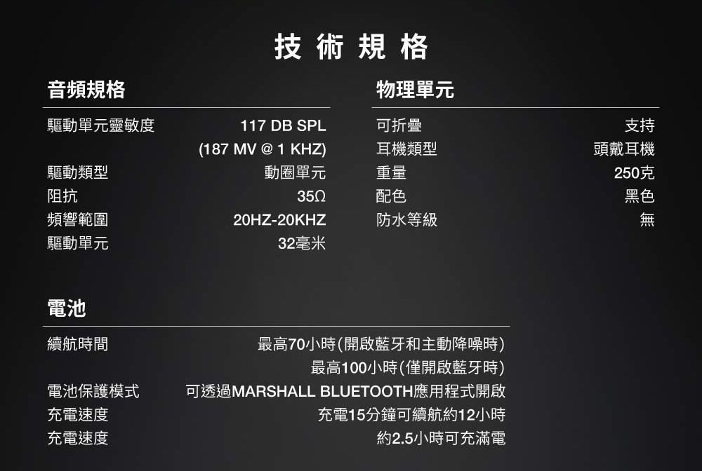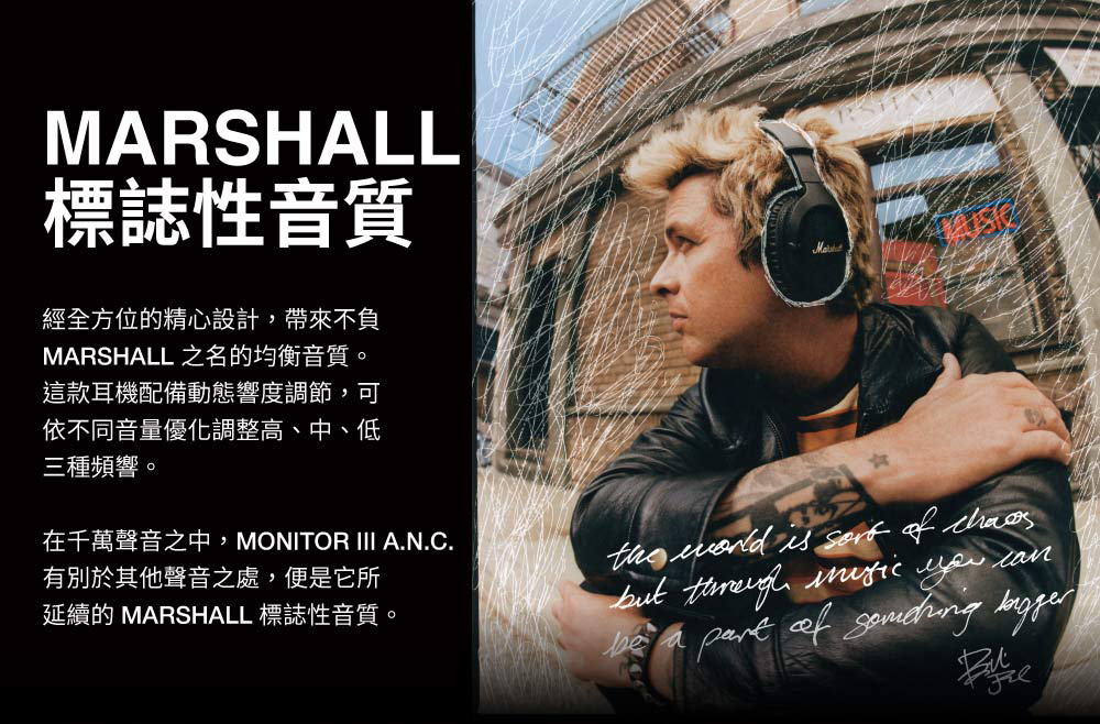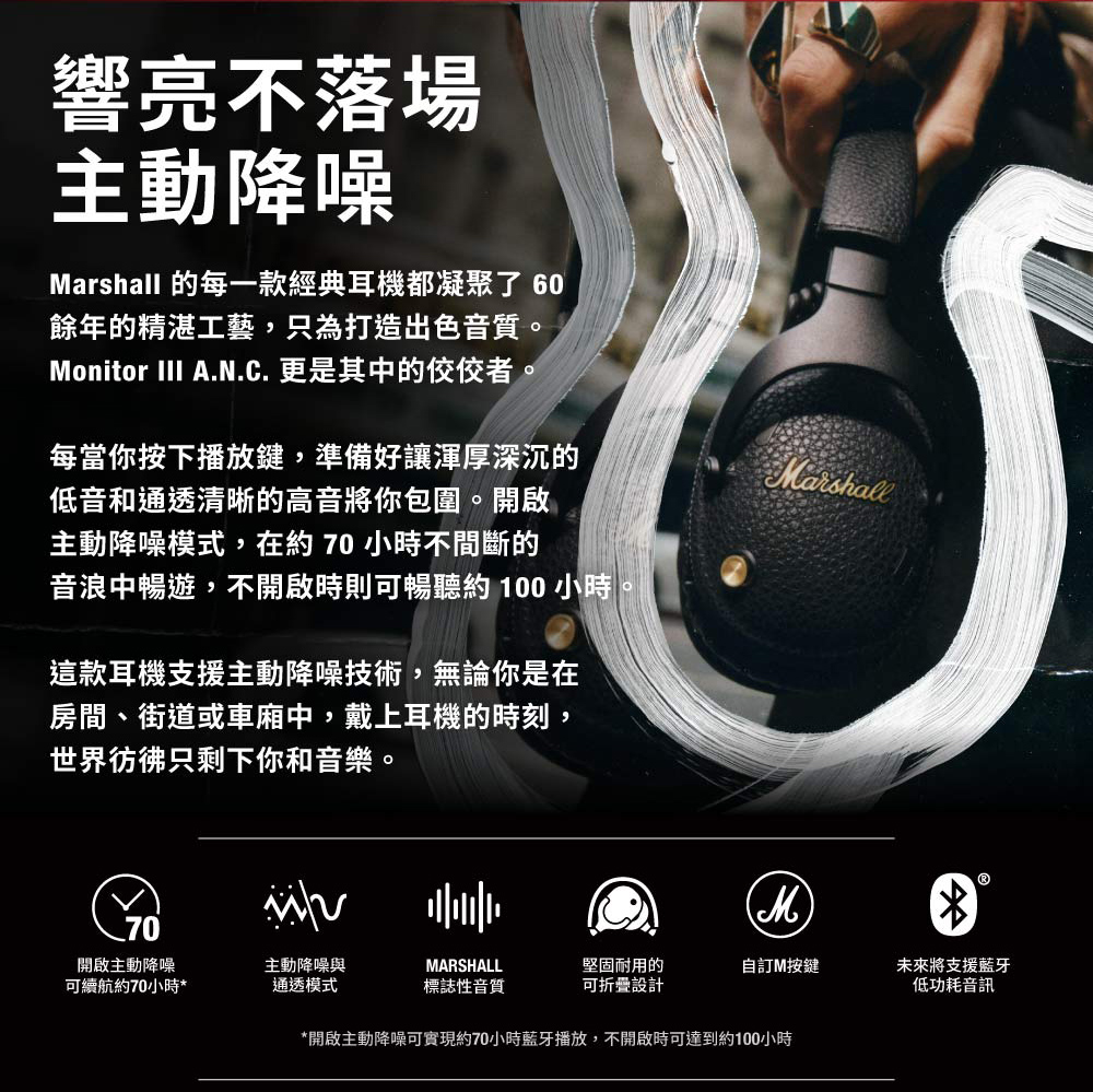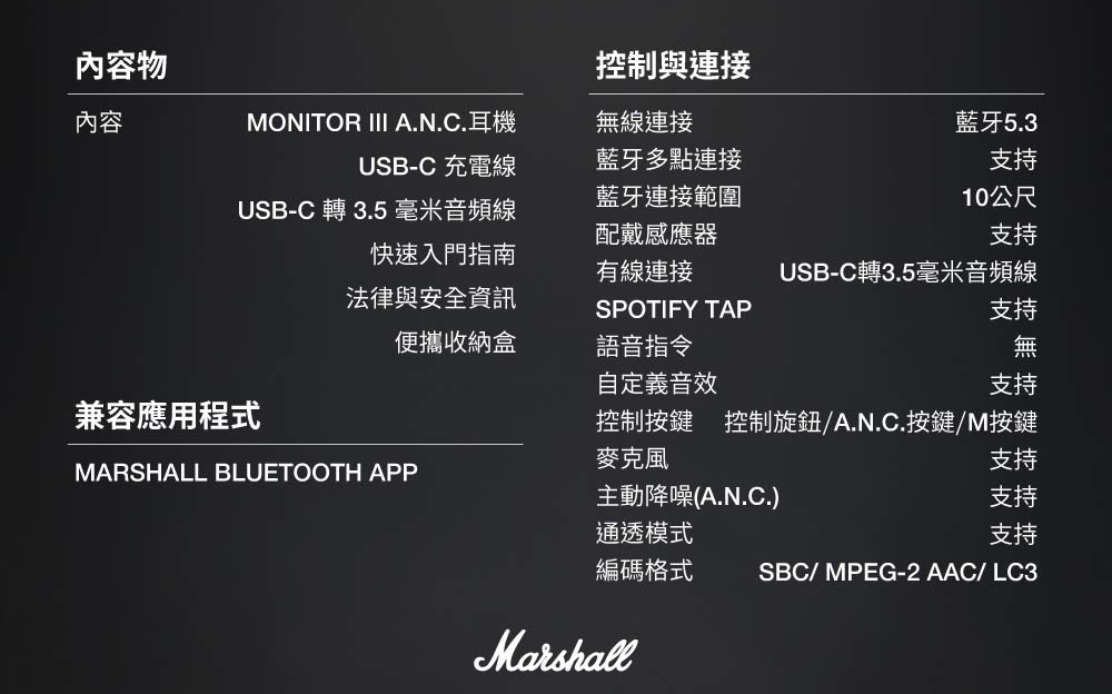 ■型號:Marshall Monito III A.N.C.■保固:一年+到貨7日內線上登錄增加半年保固■產地:中國■貨源:台灣總代理公司貨■配件/內容物:Monitor III A.N.C耳機、USB-C充電線、USB-C轉3.5mm音頻線、快速入門指南、便攜收納盒■材質:金屬、塑件■耳機類型︰可摺疊頭戴耳機■防水等級︰無■重量:250公克■驅動類型︰動圈單元■響應頻率:20 Hz – 20 kHz■驅動單元靈敏度︰117 dB SPL (187 mV @ 1 kHz)■單體阻抗:35 Ω■驅動單元:32 mm■續航時間︰最多70小時(開啟藍牙和主動降噪功能時)、最多100小時(備開啟藍牙功能)■電池保護模式︰可透過Marshall Bluetooth應用程式開啟■充電速度:充電15分鐘可續航12小時播放時間■充電速度:約2.5小時■麥克風及無線搖控:有■無線連接:藍牙5.3■藍牙多點連接︰支持■藍牙連接範圍:10公尺■配戴感應器︰支持■有線連接︰USB-C轉3.5mm音頻線■Spotify Tap︰支持■語音指令︰無■自定義音效︰支持■控制按鍵︰控制旋鈕/A.N.C.按鍵/M按鍵■麥克風︰支持■主動降噪(A.N.C.)︰支持■NCC︰CCAN24LP0460T3■BSMI︰R38900(~2027.06.05)*注意事項︰*民法第259條第六項:【買家一旦拆封使用後】應返還之物有毀損、滅失或因其他事由,致不能返還者,應償還其價額,我方將會酌收相應費用。1. 此商品為個人貼身用品,拆封後不做退換貨。7天鑑賞期內若要退換貨,須把商品恢復原狀。否則將會酌收10%~30%整新費!2. 退貨商品之包裝及內容物均須完整無破損,否則恕無法接受退換貨3. 產品顏色會因網頁呈現而有些許差異,以收到實品為準